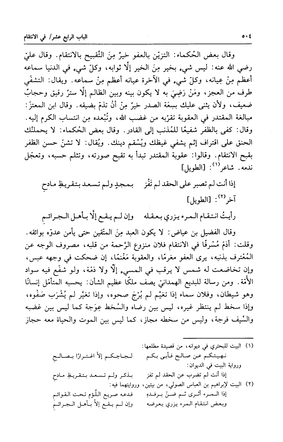 وقال بعض الحكماء التزين بالعفو خير من التقبح بالانتقام وقال علي رضي الله عنه ليس شيء بخير من الخير إلا ثوابه وكل شيء في الدنيا سماعه أعظم من عيانه وكل شيء في الاخرة عيانه أعظم من سماعه ويقال التشفي طرف من العجز ومن رضي به لا يكون بينه وبين الظالم الأستر رقيق وحجاب ضعيف ولان يثنى عليك بسعة الصدر خير من أن تذم بضيقه وقال ابن المعتز مبالغة المقتدر في العقوبة تقربه من غضب الله وتبعده من انتساب الكرم إليه وقال كفى بالظفر شفيعاً للمذنب إلى القادر وقال بعض الحكماء لا يحملنك الحنق على اقتراف اثم يشفي غيظك ويسقم دينك ويقال لا تشن حسن الظفر بقبح الانتقام وقالوا عقوبة المقتدر تبدأ به تقبح صورته وتثلم حسبه وتعجل ندمه شاعر