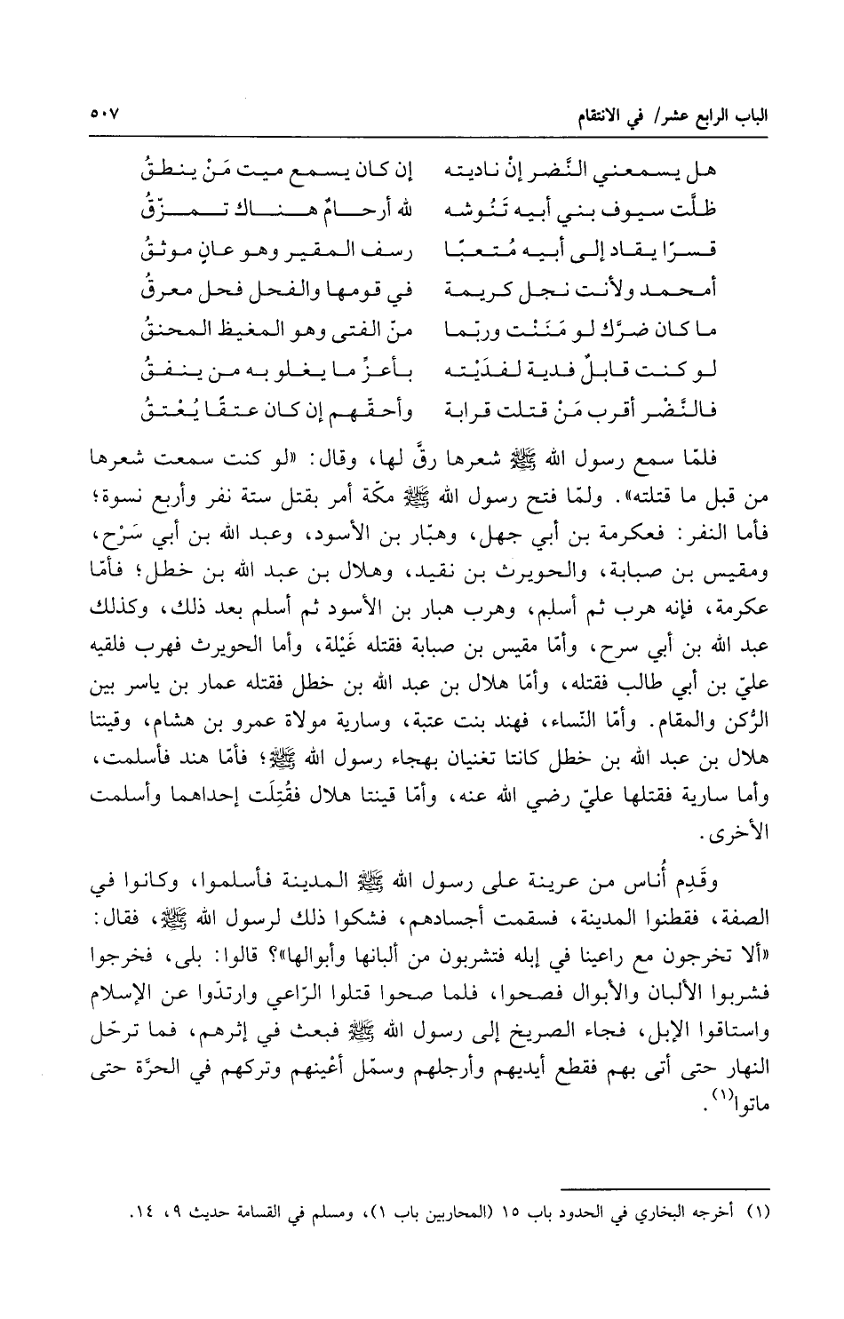 فلما سمع رسول الله صلى الله عليه وسلم شعرها رق لها وقال لو كنت سمعت شعرها من قبل ما قتلته ولما فتح رسول الله صلى الله عليه وسلم مكة أمر بقتل ستة نفر وأربع نسوة فأما النفر فعكرمة بن أبي جهل وهبار بن الأسود وعبد الله بن أبي سرح ومقيس بن صبابة والحويرث بن نقيد وهلال بن عبد الله ابن خطل فأما عكرمة فإنه هرب ثم أسلم وهرب هبار بن الأسود ثم أسلم بعد ذلك وكذلك عبد الله بن أبي سرح وأما مقيس بن صبابة فقتله غيلة وأما الحويرث فهرب فلقيه علي بن أبي طالب فقتله وأما هلال بن عبد الله بن خطل فقتله عمار بن ياسر بين الركن والمقام وأما النساء فهند بنت عتبة وسارية مولاة عمرو بن هشام وقينتا هلال بن عبد الله بن خطل كانتا تغنيان بهجاء رسول الله صلى الله عليه وسلم فأما هند فأسلمت وأما سارية فقتلها علي رضي الله عنه وأما قينتا هلال فقتلت إحداهما وأسلمت الاخرى وقدم اناس من عرينة على رسول الله صلى الله عليه وسلم المدينة فأسلموا وكانوا في الصفة فقطنوا المدينة فسقمت أجسادهم فشكوا ذلك لرسول الله صلى الله عليه وسلم فقال ألا تخرجون مع راعينا في ابله فتشربون من البانها وأبوالها قالوا بلى فخرجوا فشربوا الألبان والأبوال فصحوا فلما صحوا قتلوا الراعي وارتدوا عن الاسلام واستقاوا الابل فجاء الصريخ إلى رسول الله صلى الله عليه وسلم فبعث في اثرهم فما ترحل النهار حتى أتى بهم فقطع أيديهم وأرجلهم وسمل أعينهم وتركهم في الحرة حتى ماتوا