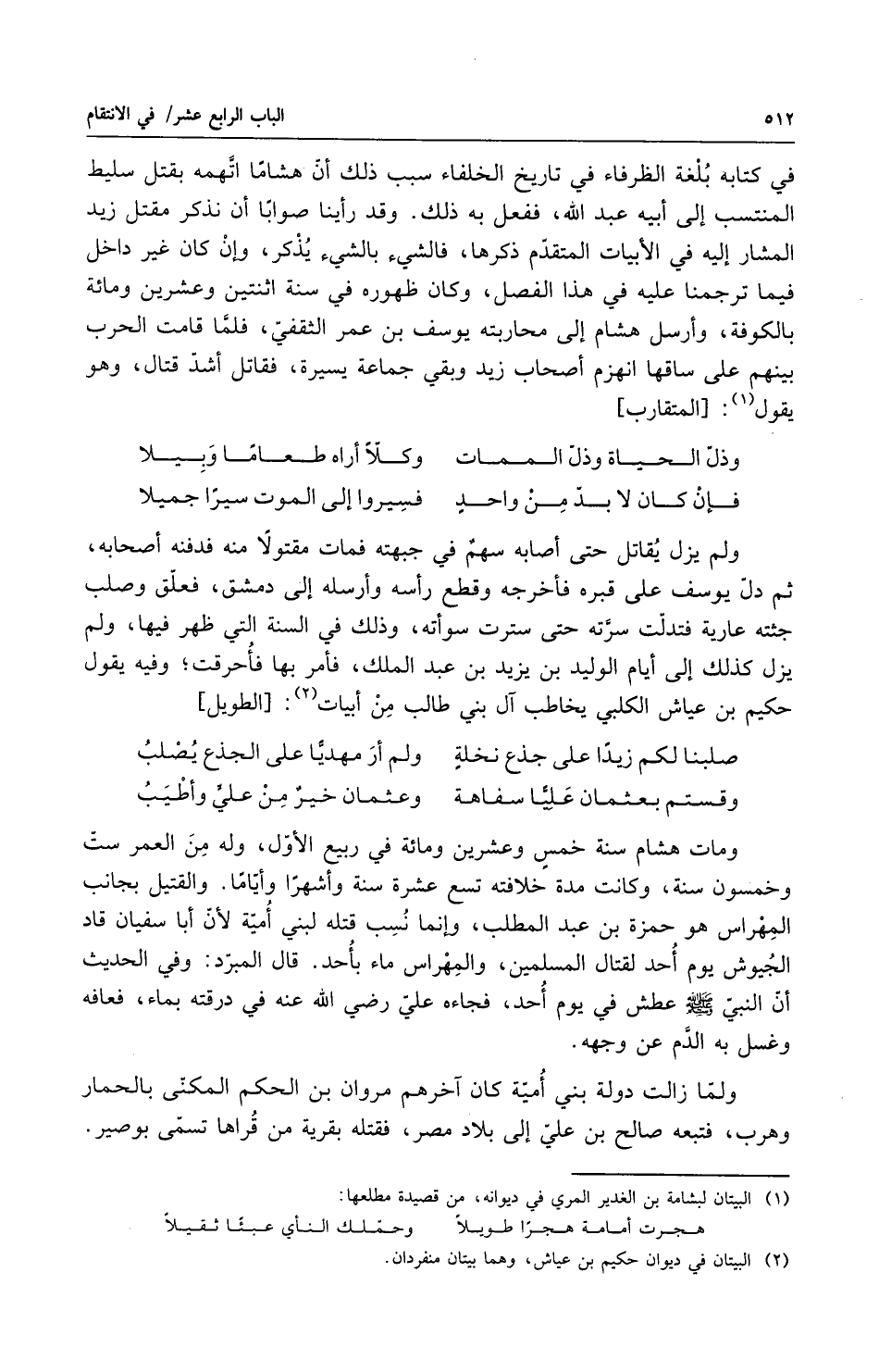 في كتابه بلغة الظرفاء في تاريخ الخلفاء سبب ذلك إن هشاماً اتهمه بقتل سليط المنتسب إلى أبيه عبد الله ففعل به ذلك وقد رأينا صواباً أن نذكر مقتل زيد المشار إليه في الأبيات المتقدم ذكرها فالشيء بالشيء يذكر وإن كان غير داخل فيما ترجمنا عليه في هذا الفصل وكان ظهوره في سنة ثنتين وعشرين ومائة بالكوفة وأرسل هشام إلى محاربته يوسف بن عمر الثقفي فلما قامت الحرب بينهم على ساقها انهزم أصحاب زيد وبقي جماعة يسيرة فقاتل أشد قتال وهو يقول