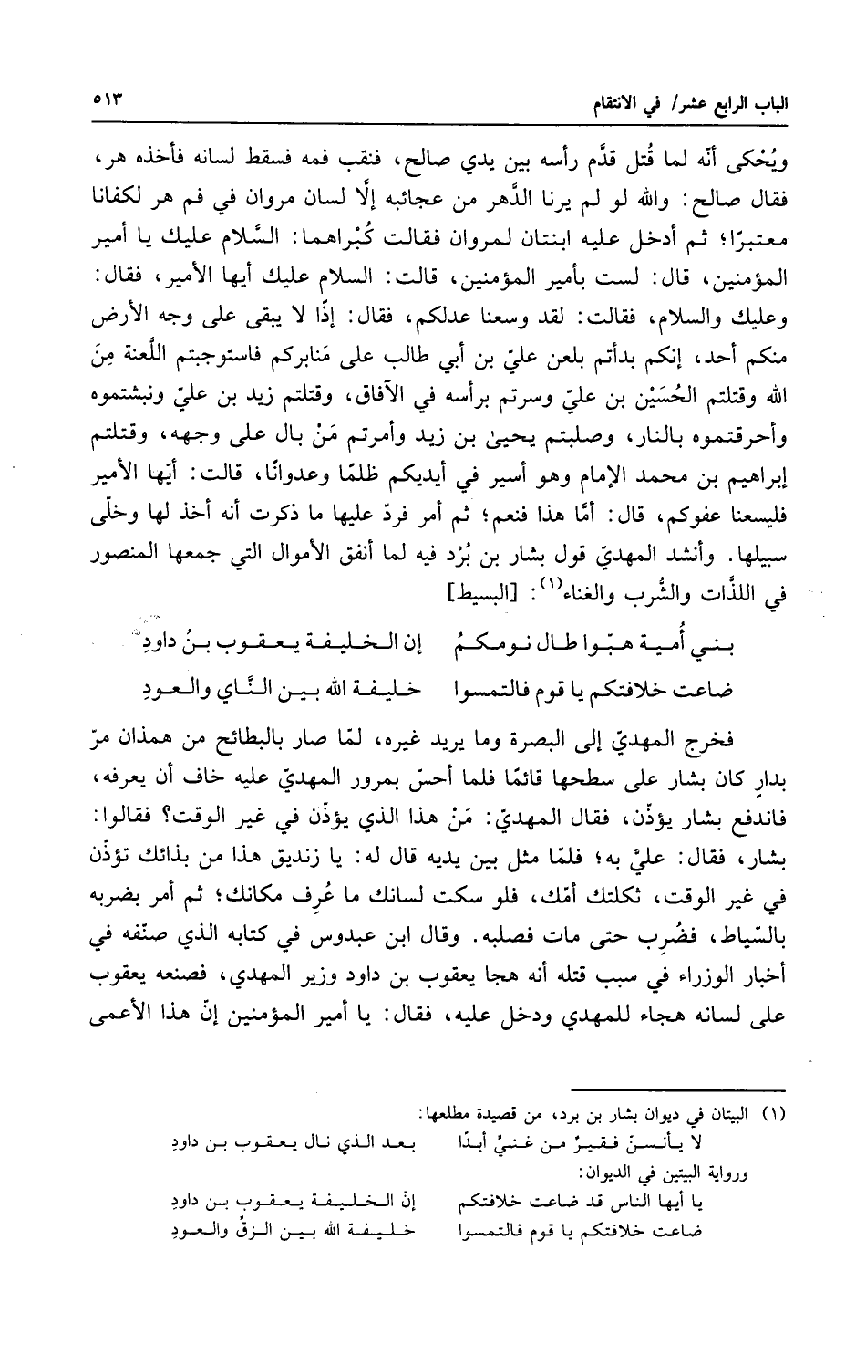 فخرج المهدي إلى البصرة وما يريد غيره فلما صار بالبطائح من همذان مر بدار كان بشار على سطحها قائماً فلما أحس بمرور المهدي عليه خاف أن يصرفه فاندفع بشار يؤذن فقال المهدي من هذا الذي يؤذن في غير الوقت فقالوا بشار فقال علي به فلما مثل بين يديه قال له يا زنديق هذا من بذائك تؤذن في غير الوقت ثكلتك أمك فلو سكت لسانك ما عرف مكانك ثم أمر بضربه بالسياط فضرب حتى مات فصلبه وقال ابن عبدوس في كتابه الذي صنفه في أخبار الوزراء في سبب قتله إنه هجا يعقوب بن داود وزير المهدي فصنع يعقوب على لسانه هجاء للمهدي ودخل عليه فقال يا أمير المؤمنين إن هذا الأعمى