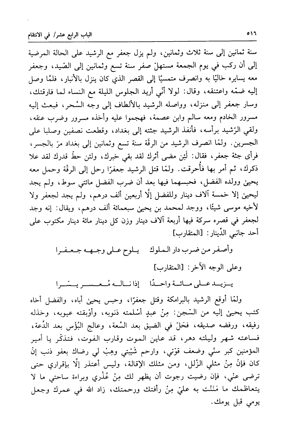 سنة ثمانين إلى سنة ثلاث وثمانين ولم يزل جعفر مع الرشيد على الحالة المرضية إلى أن ركب في يوم الجمعة مستهل صفر سنة تسع وثمانين إلى الصيد وجعفر معه يسايره خالياً به وانصرف متمسياً إلى القصر الذي كان ينزله بالأنبار فلما وصل إليه ضمه واعتنقه وقال لولا إني أريد الجلوس الليلة مع النساء لما فارقتك وسار جعفر إلى منزله وواصله الرشيد بالألطاف إلى وجه السحر فبعث إليه مسروراً الخادم ومعه سالم وابن عصمة فهجموا عليه وأخذه مسرور وضرب عنقه ولقي الرشيد برأسه فانفذ الرشيد جثته إلى بغداد وقطعت نصفين وصلبا على الجسرين ولما انصرف الرشيد من الرقة سنة تسع وثمانين إلى بغداد مر بالجسر فرأى جثة جعفر فقال لئن مضى أثرك لقد بقي خبرك ولئن حط قدرك لقد علا ذكرك ثم أمر بها فأحرقت ولما قتل الرشيد جعفراً رحل إلى الرقة وحمل معه يحيى وولده الفضل فحبسهما فيها بعد أن ضرب الفضل مائتي سوط ولم يجد ليحيى إلا خمسة آلاف دينار وللفضل إلا أربعين ألف درهم ولم يجد لجعفر ولا لأخيه موسى شيأً ووجد لمحمد بن يحيى سبعمائة ألف درهم ويقال إنه وجد لجعفر في قصره سركة فيها أربعة آلاف دينار وزن كل دينار مائة دينار مكتوب على أحد جانبي الدينار