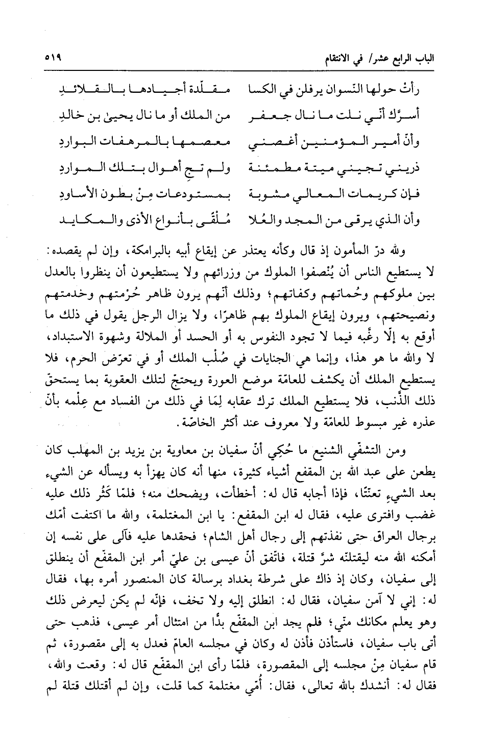 ولله در المأمون إذ قال وكأنه يعتذر عن ايقاع أبيه بالبرامكة وإن لم يقصده لا يستطيع الناس أن ينصفوا الملوك من وزرائهم ولا يستطيعون أن ينظروا بالعدل بين ملوكهم وحماتهم وكفاتهم وذلك أنهم يرون ظاهر حرمتهم وخدمتهم ونصيحتهم ويرون ايقاع الملوك بهم ظاهراً ولا يزال الرجل يقول في ذلك ما أوقع به إلا رغبه في ماله أو رغبه فيما لا تجود النفوس به أو الحسد أو الملالة وشهوة الاستبداد لا والله ما هو هذا وإنما هي لجنايات في صلب الملك أو في تعرض الحرم فلا يستطيع الملك أن يكشف للعامة موضع العورة ويحتج لتلك العقوبة بما يستحق ذلك الذنب فلا يستطيع الملك ترك عقابه لما في ذلك من الفساد مع علمه بأن عذره غير مبسوط للعامة ولا معروف عند أكثر الخاصة ومن التشفي الشنيع ما حكي أن سفيان بن معاوية بن يزيد بن المهلب كان يطعن على عبد الله بن المقفع أشياء كثيرة منها أنه كان يهزأ به ويسأله عن الشيء بعد الشيء تعنتاً فإذا أجابه قال له أخطأت ويضحك منه فلما كثر ذلك عليه غضب وافترى عليه فقال له ابن المقفع يا ابن المغتلمة والله ما اكتفت أمك برجال العراق حتى نفذتهم إلى رجال أهل الشام فحقدها عليه فآلى على نفسه إن أمكنه الله منه ليقتلنه شر قتلة فاتفق أن عيسى بن علي أمر ابن المقفع أن ينطلق إلى سفيان وكان إذ ذاك على شرطة بغداد برسالة كان المنصور أمره بها فقال له إني لا آمن سفيان فقال له انطلق إليه ولا تخف فإنه لم يكن ليعرض ذلك وهو يعلم مكانك مني فلم يجد ابن المقفع بداً من امتثال أمر عيسى فذهب حتى أتى باب سفيان فاستأذن فأذن له وكان في مجلسه العام فعدل به إلى مقصورة ثم قام سفيان من مجلسه إلى المقصورة فلما رأى ابن المقفع قال له وقعت والله فقال له أنشدك بالله تعالى فقال أمي مغتلمة كما قلت إن لم أقتلك قتلة لم
