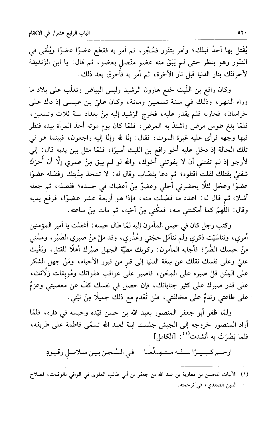 يقتل بها أحد قبلك وأمر بتنور فسجر ثم أمر به فقطع عضواً عضواً ويلقى ي التنور وهو ينظر حتى لم يبق منه عضو متصل بعضو ثم قال يا ابن الزنديقة لا حرقنك بنار الدنيا قبل نار الآخرة ثم أمر به فأحرق بعد ذلك وكان رافع بن الليث خلع هرون الرشيد ولبس البياض وتغلب على بلاد ما وراء النهر وذلك في سنة تسعين ومائة وكان علي بن عيسى إذ ذاك على خراسان فحاربه فلم يقدر عليه فخرج الرشيد إليه من بغداد سنة ثلاث وتسعين فلما بلغ طوس مرض واشتد به المرض فلما كان يوم موته أخذ المرآة بيده فنظر فيها وجهه فرأى عليه غبرة الموت فقال إنا لله وإنا إليه راجعون فبينما هو في تلك الحالة إذ دخل عليه أخو رافع بن الليث أسيراً فلما مثل بين يديه قال إني لأرجو إذ لم تفتني أن لا يفوتني أخوك والله لو لم يبق من عمري إلا أن أحرك شفتي بقتلك لقلت اقتلوه ثم دعا بقصاب وقال له لا تشحذ مديتك وفصله عضواً عضواً وعجل لئلا يحضرني أجلي وعضو من أعضائه في جسده ففصله ثم جعله أشلاء ثم قال له اعدد ما فصلت منه فإذا هو أربعة عشر عضواً فرفع يديه وقال اللهم كما أمكنتني منه فمكني من أخيه ثم مات من ساعته وكتب رجل كان في حبس المأمون إليه لما طال حبسه أغفلت يا أمير المؤمنين أمري وتناسيت ذكري ولم تتأمل حجتي وعذري وقد مل من صبري الصبر ومسني من حبسك الضر فأجابه المأمون ركوبك مطية الجهل صيرك أهلاً للقتل وبغيك علي وعلى نفسك نقلك عن سعة الدنيا إلى قبر من قبور الأحيا ومن جهل الشكر على المنن قل صبره على المحن فاصبر على عواقب هفواتك وموبقات زلاتك على قدر صبرك على كثير جناياتك فإن حصل في نفسك ف عن معصيتي وعزم على طاعتي وندم على مخالفتي فلن تعدم مع ذلك جميلاً من نيتي ولما ظفر أبو جعفر المنصور بعبد الله بن حسن قيده وحبسه في داره فلما أراد المنصور خروجه إلى الجيش جلست ابنة لعبد الله تسمى فاطمة على طريقه فلما بصرت به أنشدت