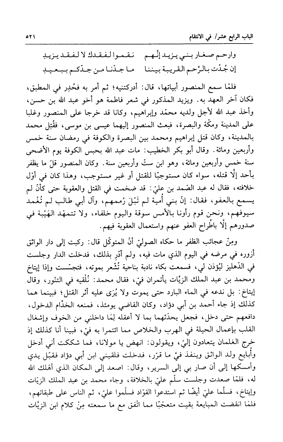 فلما سمع المنصور أبياتها قال أدركتنيه ثم أمر به فحدر في المطبق فكان آخر العهد به ويزيد المذكور في شعر فاطمة هو أخو عبد الله بن حسن وأخذ عبد الله لأجل ولديه محمد وإبراهيم وكانا قد خرجا على المنصور وغلبا على المدينة ومكة والبصرة فبعث المنصور إليهما عيسى بن موسى فقتل محمد بالمدينة وكان قتل إبراهيم ومحمد بين البصرة والكوفة في رمضان سنة خمس وأربعين ومائة وقال أبو بكر الخطيب مات عبد الله بحبس الكوفة يوم الأضحى سنة خمس وأربعين ومائة وهو ابن ست وأربعين سنة وكان المنصور قل ما يظفر بأحد إلا قتله سواء كان مستوجباً للقتل أو غير مستوجب وهذا كان في أول خلافته فقال له عبد الصمد بن علي قد ضخمت في القتل والعقوبة حتى كان لم يسمع بالعفو فقال إن بني أمية لم تبل رممهم وآل أبي طالب لم تغمد سيوفهم ونحن قوم رأونا بالأمس سوقة واليوم خلفاء ولا تتمهد الهيبة في صدورهم إلا باطراح العفو عنهم واستعمال العقوبة فيهم ومن عجائب الطفر ما حكاه الصولي أن المتوكل قال ركبت إلى دار الواثق أزوره في مرضه في اليوم الذي مات فيه ولم أدر بذلك فدخلت الدار وجلست في الدهليز ليؤذن لي فسمعت بكاء نادبة بناحية تشعر بمونه فتجسست وإذا اتياخ ومحمد بن عبد الملك الزيات يأتمران في فقال محمد نلقيه في التنور وقال اتياخ بل ندعه في الماء البارد حتى يموت ولا يرى عليه أثر القتل فبينما هما كذلك إذ جاء أحمد بن أبي دواد وكان القاضي يومئذ فمنعه الخدام الدخول فدافعهم حتى دخل فجعل يحدثهما بما لا أعقله لما داخلني من الخوف واشغال القلب بأعمال الحيلة في الهرب والخلاص مما ائتمرا به في فبينا أنا كذلك إذ خرج الغلمان يتعادون إلي ويقولون انهض يا مولانا فما شككت أني أدخل وأبايع ولد الواثق وينفذ في ما قرر فدخلت فلقيني ابن أبي دواد فقبل يدي وأمسكها إلى أن صار بي إلى السرير وقال اصعد إلى المكان الذي أهلك الله فلما صعدت وجلست سلم علي بالخلافة وجاء محمد بن عبد الملك الزيات واتياخ فسلما علي أيضاً ثم استدعوا القواد فسلموا علي ثم الناس على طبقاتهم فلما انقضت المبايعة بقيت متعجباً مما اتفق مع ما سمعته من كلام ابن الزيات