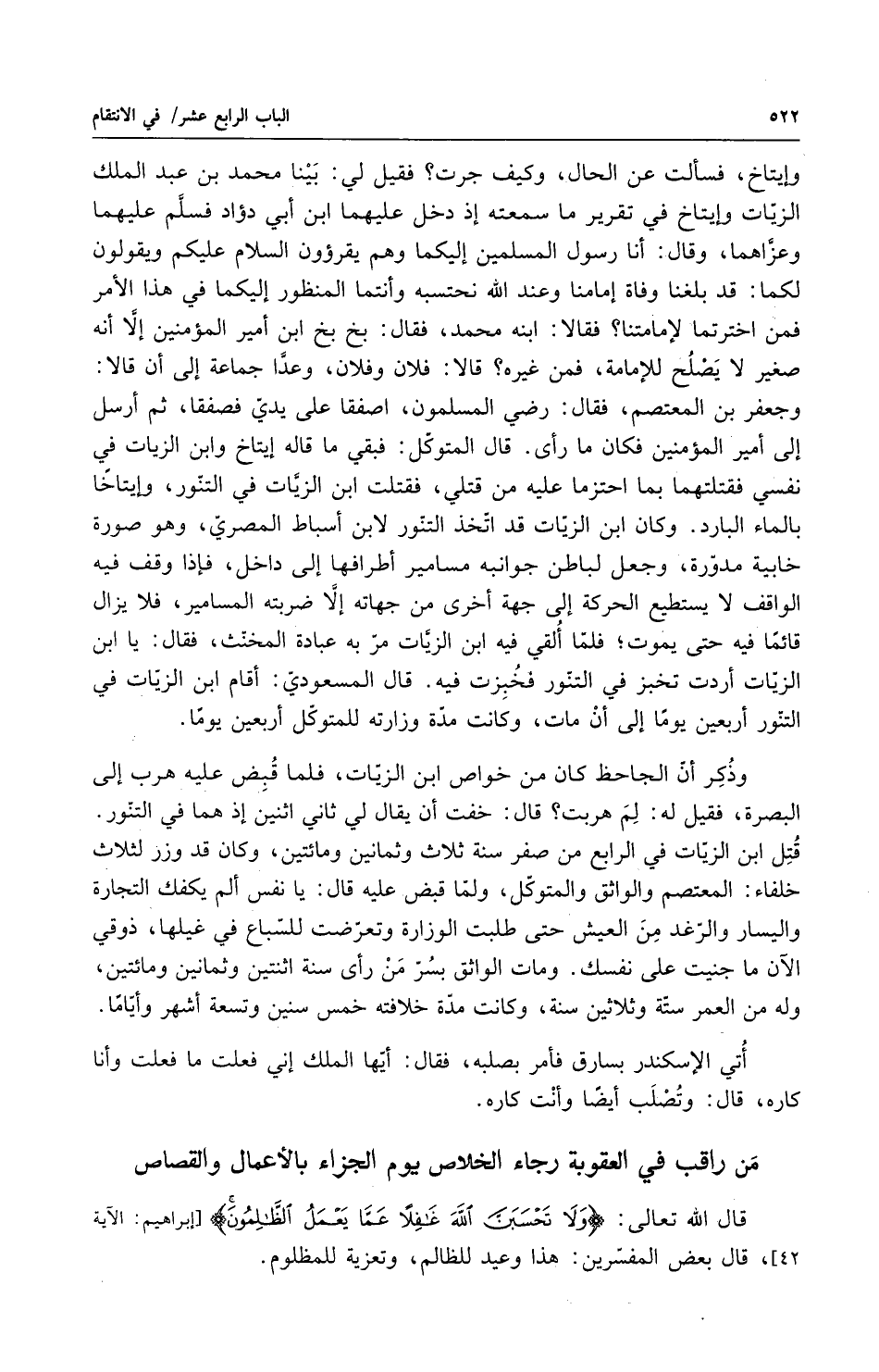 واتياخ فسألت عن الحال وكيف جرت فقيل لي بينا محمد بن عبد الملك الزيات واتياخ في تقرير ما سمعته إذ دخل عليهما ابن أبي دواد فسلم عليهما وعزاهما وقال أنا رسول المسلمين إليكما وهم يقرؤن السلام عليكما ويقولون لكما قد بلغا وفاة امامنا وعند الله نحتسبه وأنتما المنظور إليكما في هذا الأمر فمن اخترتما لامامتنا فقالا ابنه محمد فقال بخ بخ ابن أمير المؤمنين إلا أنه صغير لا يصلح للامامة فمن غيره قالا فلان وفلان وعدا جماعة إلى أن قالا وجعفر بن المعتصم فقال رضى المسلمون اصفقا على يدي فصفقا ثم أرسل إلى أمير المؤمنين فكان ما رأى قال المتوكل فبقى ما قاله اتياخ وابن الزيات في نفسي فقتلتهما بما احتز ما عليه من قتلي فقتلت ابن الزيات في التنور واتياخاً بالماء البارد وكان ابن الزيات قد اتخذ التنور لابن أسباط المصري وهو صورة خابية مدورة وجعل لباطن جوانبه مسامير أطرافها إلى داخل فإذا وقف فيه الواقف لا يستطيع الحركة إلى جهة أخرى من جهاته إلا ضربته المسامير فلا يزال قائماً فيه حتى يموت فلما ألقى فيه ابن الزيات مر به عبادة المخنث فقال يا ابن الزيات أردت تخبز في التنور فخبزت فيه قال المسعودي أقام ابن الزيات في التنور أربعين يوماً إلى أن مات وكانت مدة وزارته للمتوكل أربعين يوماً وذكر أن الجاحظ كان من خواص ابن الزيات فلما قبض عليه هرب إلى البصرة فقيل له لم هربت قال خفت أن يقال لي ثاني اثنين إذ هما في التنور قتل ابن الزيات في الرابع من صفر سنة ثلاث وثمانين ومائتين وكان قد وزر لثلاث خلفاء المعتصم والواثق والمتوكل ولما قبض عليه قال يا نفس ألم يكفك التجارة واليسار والرغد من العيش حتى طلبت الوزارة وتعرضت للسباع في غيلها ذوقي الان ما جنيت على نفسك ومات الواثق بسر من رأى سنة اثنتين وثمانين ومائتين وله من العمر ستة وثلاثون سنة وكانت مدة خلافته خمس سنين وتسعة أشهر وأياماً أتى الاسكندر بسارق فأمر بصلبه فقال أيها الملك إني فعلت ما فعلت وأنا كاره قال وتصلب أيضاً وأنت كاره