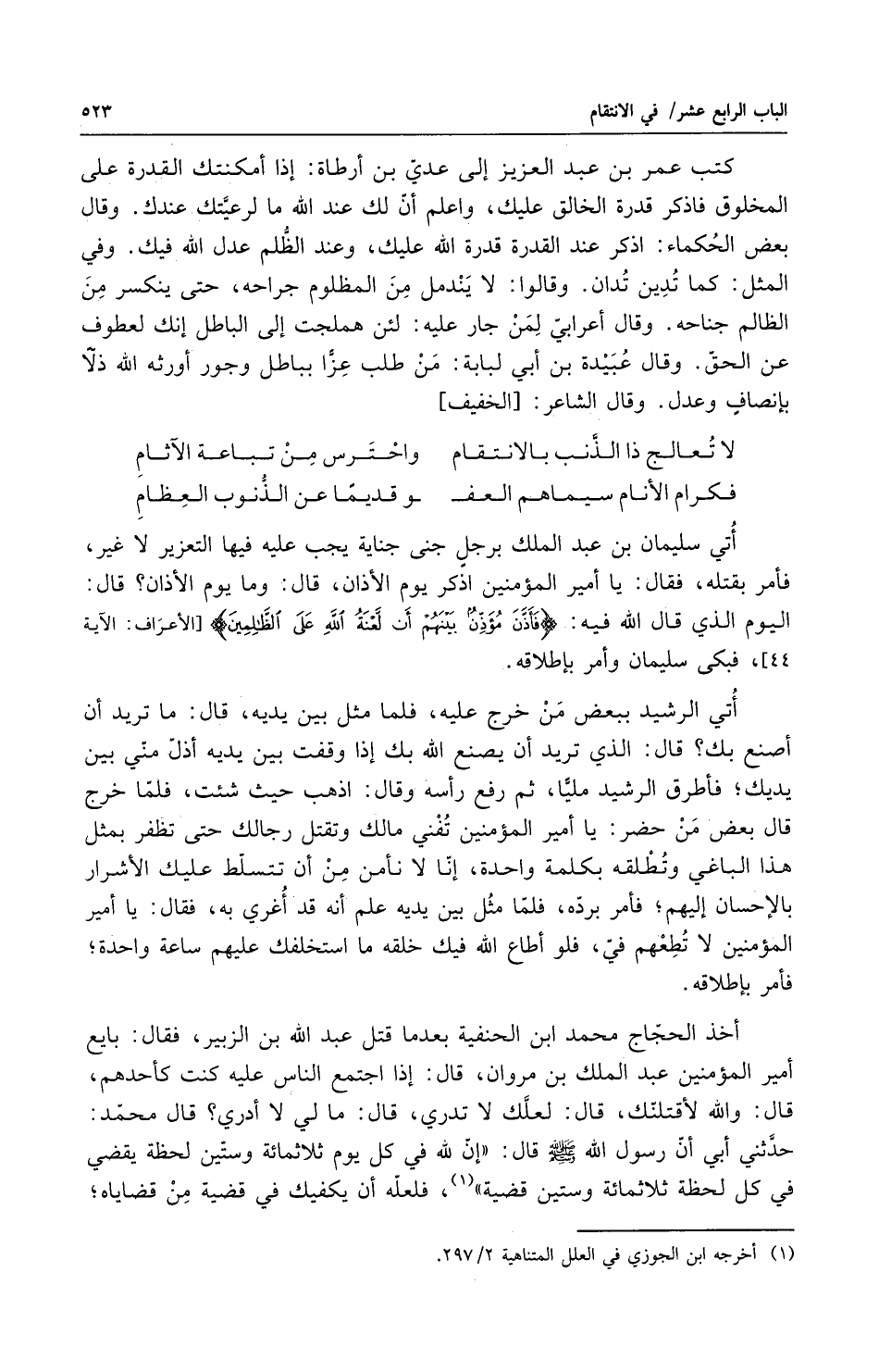 أتى سليمان بن عبد الملك برجل جنى جناية يجب عليه فيها التعزير لا غير فأمر بقتله فقال يا أمير المؤمنين اذكر يوم الآذان قال وما يوم الآذان قال اليوم الذي قال الله فيه فأذن مؤذن بينهم إن لعنة الله على الظالمين فبكى سليمان وأمر باطلاقه أتى الرشيد ببعض من خرج عليه فلما مثل بين يديه قال ما تريد ان أصنع بك قال الذي تريد أن يصنع الله بك إذا وقفت بين يديه أذل مني بين يديك فاطرق الرشيد ملياً ثم رفع رأسه وقال اذهب حيث شئت فلما خرج قال بعض من حضر يا أمير المؤمنين تفنى مالك وتقتل رجالك حتى تظفر بمثل هذا الباغي وتطلقه بكلمة واحدة انا لا نأمن أن تتسلط عليك الأشرار بالاحسان إليهم فأمر برده فلما مثل بين يديه علم إنه قد أغرى به فقال يا أمير المؤمنين لا تطعهم في فلو أطاع الله فيك خلقه ما استخلفك عليهم ساعة واحدة فأمر باطلاقه أخذ الحجاج محمد بن الحنفية بعد ما قتل عبد الله بن الزبير فقال بايع أمير المؤمنين عبد الملك بن مروان قال إذا اجتمع الناس عليه كنت كأحدهم قال والله لاقتلنك قال لعلك لا تدري قال مالي لا أدري قال محمد حدثني أبي أن رسول الله صلى الله عليه وسلم قال إن لله في كل يوم ثلثمائة وستين لحظة يقضي في كل لحظة ثلثمائة وستين قضية فلعله أن يكفيك في قضية من قضاياه
