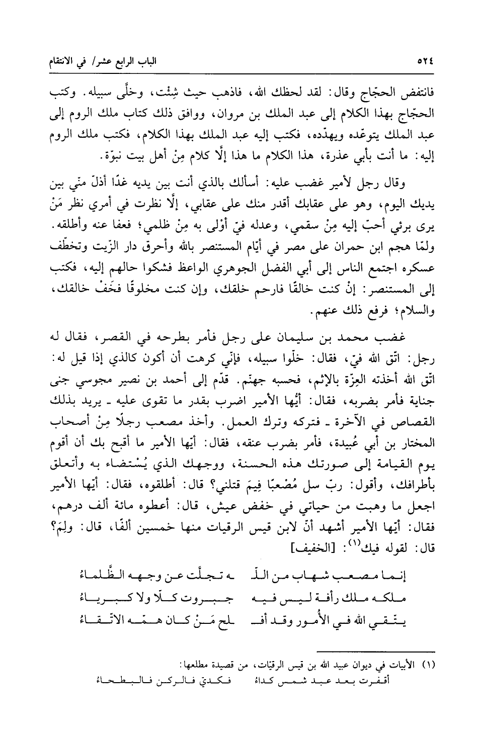 فانتفض الحجاج وقال لقد لحظك الله فاذهب حيث شئت وخلى سبيله وكتب الحجاج بهذا الكلام إلى عبد الملك بن مروان ووافق ذلك كتاب ملك الروم إلى عبد الملك يتوعده ويهدده فكتب إليه عبد الملك بهذا الكلام فكتب ملك الروم إليه ما أنت بأبي عذرة هذا الكلام ما هذا إلا كلام من أهل بيت نبوة وقال رجل لأمير غضب عليه أسألك بالذي أنت بين يديه غداً أذل مني بين يديك اليوم وهو على عقابك أقدر منك على عقابي إلا نظرت في أمري نظر من يرى برءي أحب إليه من سقمي وعدله في أولى به من ظلمي فعفا عنه وأطلقه ولما هجم ابن حمران على مصر في أيام المستنصر بالله واحرق دار الزيت وتخطف عسكره اجتمع الناس إلى أبي الفضل الجوهري الواعظ فشكوا حالهم إليه فكتب إلى المستنصر إن كنت خالقاً فارحم خلقك وإن كنت مخلوقاً فخف خالقك والسلام فرفع ذلك عنهم غضب محمد بن سليمان على رجل فأمر بطرحه في القصر فقال له رجل اتق الله في فقال خلوا سبيله فإني كرهت أن أكون كالذي إذا قيل له اتق الله أخذته العزة بالاثم فحسبه جهنم قدم إلى أحمد بن نصير مجوسي جنى جناية فأمر بضربه فقال أيها الأمير اضرب بقدر ما تقوى عليه يريد بذلك القصاص في الآخرة فتركه وترك العمل وأخذ مصعب رجلاً من أصحاب المختار بن أبي عبيدة فأمر بضرب عنقه فقال أيها الأمير ما أقبح بك ان أقوم يوم القيامة إلى صورتك هذه الحسنة ووجهك الذي يستضاء به وأتعلق بأطرافك وأقول رب سل مصعباً فيم قتلني قال أطلقوه فقال أيها الأمير اجعل ما وهبت من حياتي في خفض عيش قال اعطوه مائة ألف درهم فقال أيها الأمير أشهد أن لابن قيس الرقيات منها خمسين الفاً قال ولم قال لقوله فيك