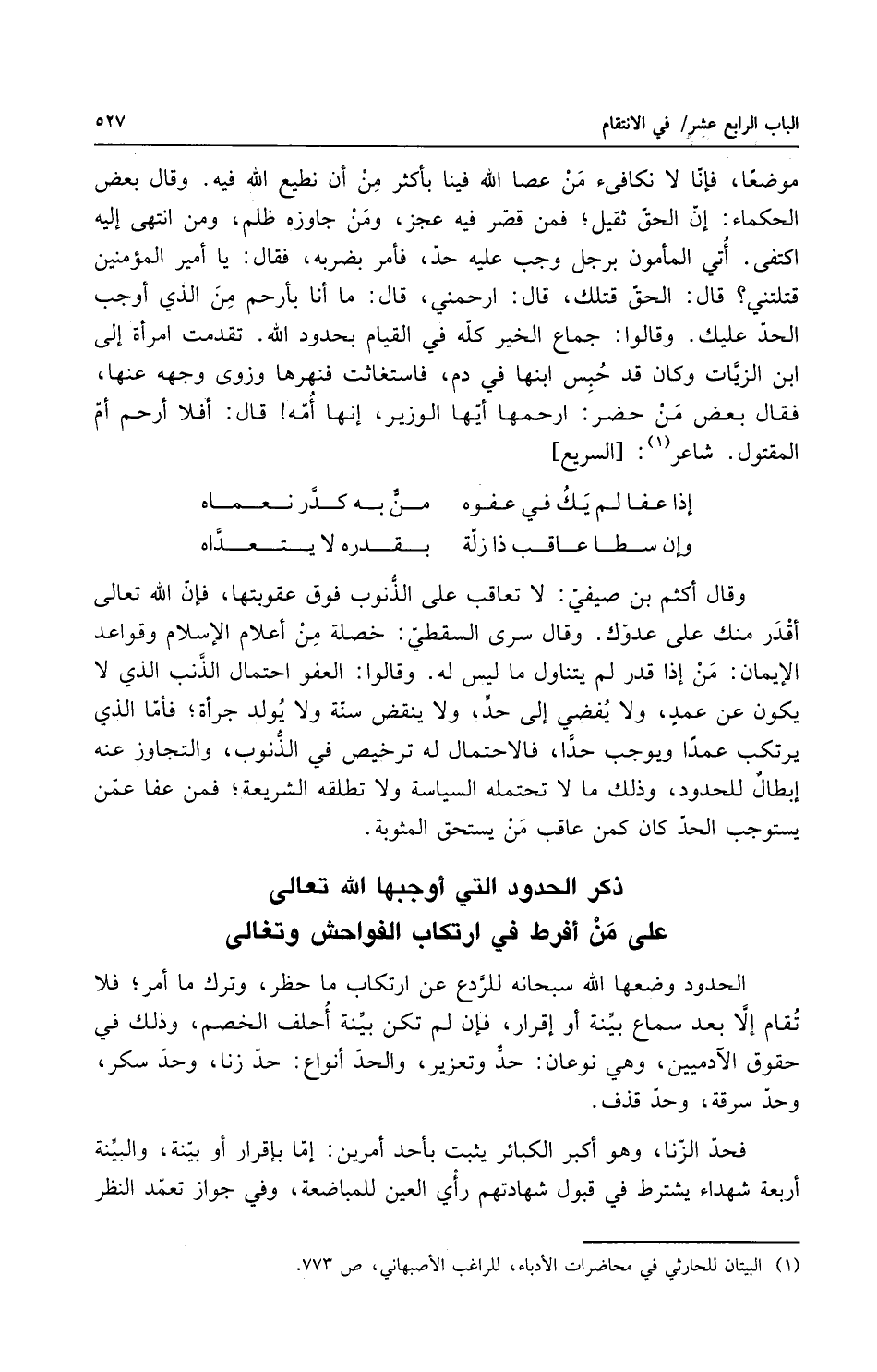 وقال أكثم بن صيفي لا تعاقب على الذنوب فوق عقوبتها فإن الله تعالى أقدر منك على عدوك وقال سرى السفطي خصلة من أعلام الاسلام وقواعد الايمان من إذا قدر لم يتناول ما ليس له وقالوا العفو احتمال الذنب الذي لا يكون عن عمد ولا يفضي إلى حد ولا ينقض سنة ولا يولد جرأة فأما الذي يرتكب عمداً ويوجب حداً فالاحتمال له ترخص في الذنوب والتجاوز عنه أبطال للحدود وذلك ما لا تحتمله السياسة ولا تطلقه الشريعة فمن عفا عمن يستوجب الحد كان كمن عاقب من يستحق المثوبة ذكر الحدود التي أوجبها الله تعالى على من أفرط في ارتكاب الفواحش وتغالى الحدود وضعها الله سبحانه للردع عن ارتكاب ما خطر وترك ما أمر فلا تقام إلا بعد سماع بينة أو اقرار فإن لم تكن بينة أحلف الخصم وذلك في حقوق الآدميين وهي نوعان حد وتعزير والحد أنواع حد زنا وحد سكر وحد سرقة وحد قذف فحد الزنا وهو أكبر الكبائر يثبت بأحد أمرين أما باقرار أو بينة والبينة أربعة شهداء يشترط في قبول شهادتهم رأى العين للمباضعة وفي جواز تعمد النظر