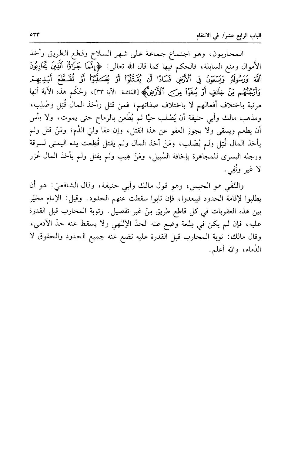 المحاربون وهو اجتماع جماعة على شهر السلاح وقطع الطريق وأخذ الأموال ومنع السابلة فالحكم فيهم كما قال الله تعالى إنما جزاء الذين يحاربون الله ورسوله ويسعون في الأرض فساداً أن يقتلوا أو يصلبوا أو تقطع أيديهم وأرجلهم من خلاف أو ينفوا من الأرض وحكم هذه الآية أنها مرتبة باختلاف أفعالهم لا باختلاف صفاتهم فمن قتل وأخذ المال قتل وصلب ومذهب مالك وأبي حنيفة أن يصلب حياً ثم يطعن بالرماح حتى يموت ولا بأس أن يطعم ويسقى ولا يجوز العفو عن هذا القتل وإن عفا ولي الدم ومن قتل ولم يأخذ المال قتل ولم يصلب ومن أخذ المال ولم يقتل قطعت يده اليمنى للسرقى ورجله اليسرى للمجاهرة باخافة السبيل ومن هيب ولم يقتل ولم يأخذ المال عزر لا غير ونفى والنفي هو الحبس وهو قول مالك وأبي حنيفة وقال الشافعي هو أن يطلبوا الاقامة الحدود فيبعدوا فإن تابوا سقطت عنهم الحدود وقيل الامام مخير بين هذه العقوبات في كل قاطع طريق من غير تفصيل وتوبة المحارب قبل القدرة عليه فإن لم يكن في منعة وضع عنه الحد الالهي ولا يسقط عنه حد الآدمي وقال مالك توبة المحارب قبل القدرة عليه تضع عنه جميع الحدود والحقوق إلا الدماء والله أعلم