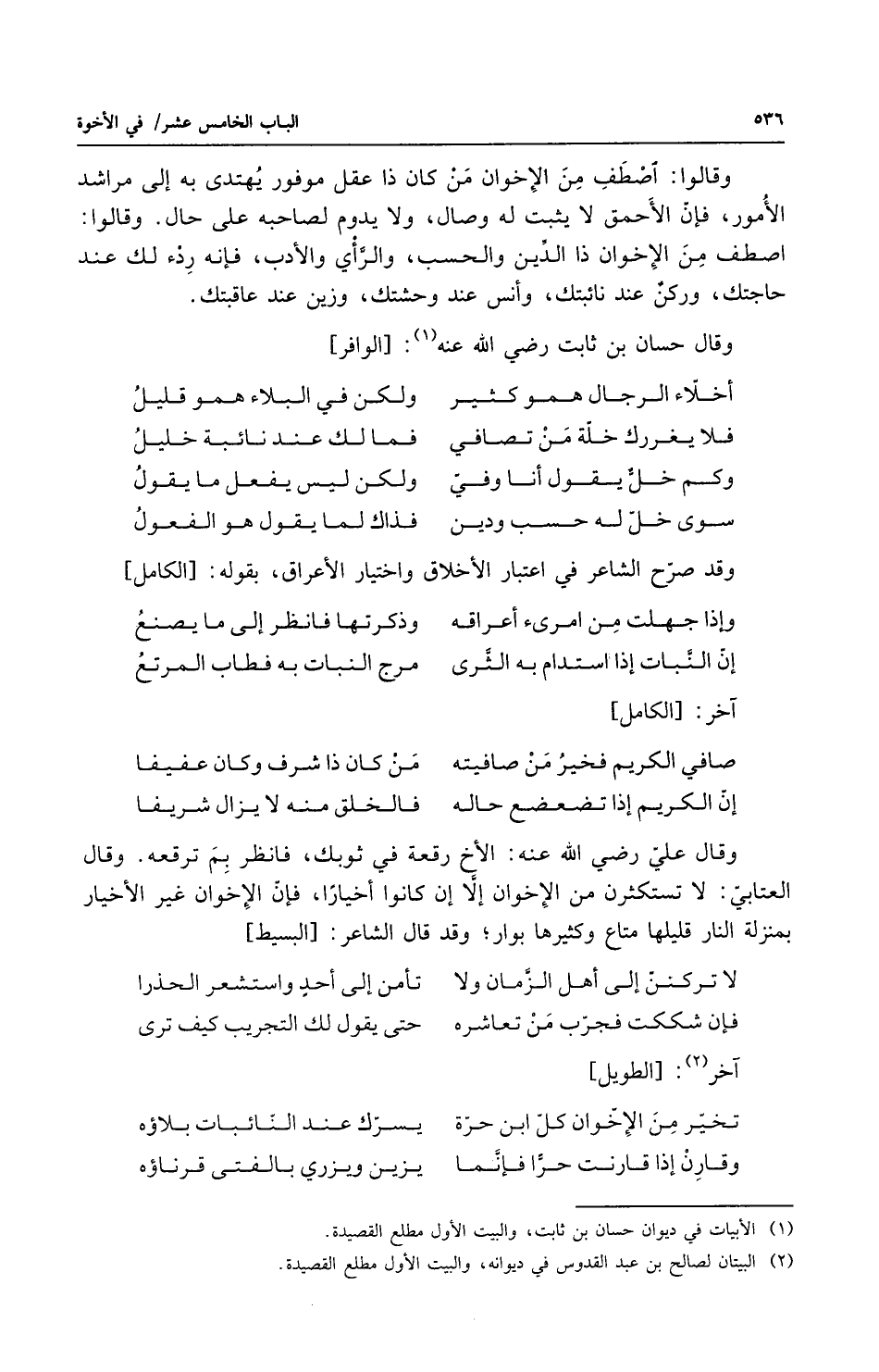 وقالوا اصطف من الاخوان من كان ذا عقل موفور يهتدي به إلى مراشد الأمور فإن الأحمق لا يثبت له وصال ولا يدوم لصاحبه على حال وقالوا اصطف من الاخوان ذا الدين والحسب والرأي والأدب فإنه ردء لك عند حاجتك وركن عند نائبتك وأنس عند وحشتك وزين عند عاقبتك وقال حسان بن ثابت رضي الله عنه