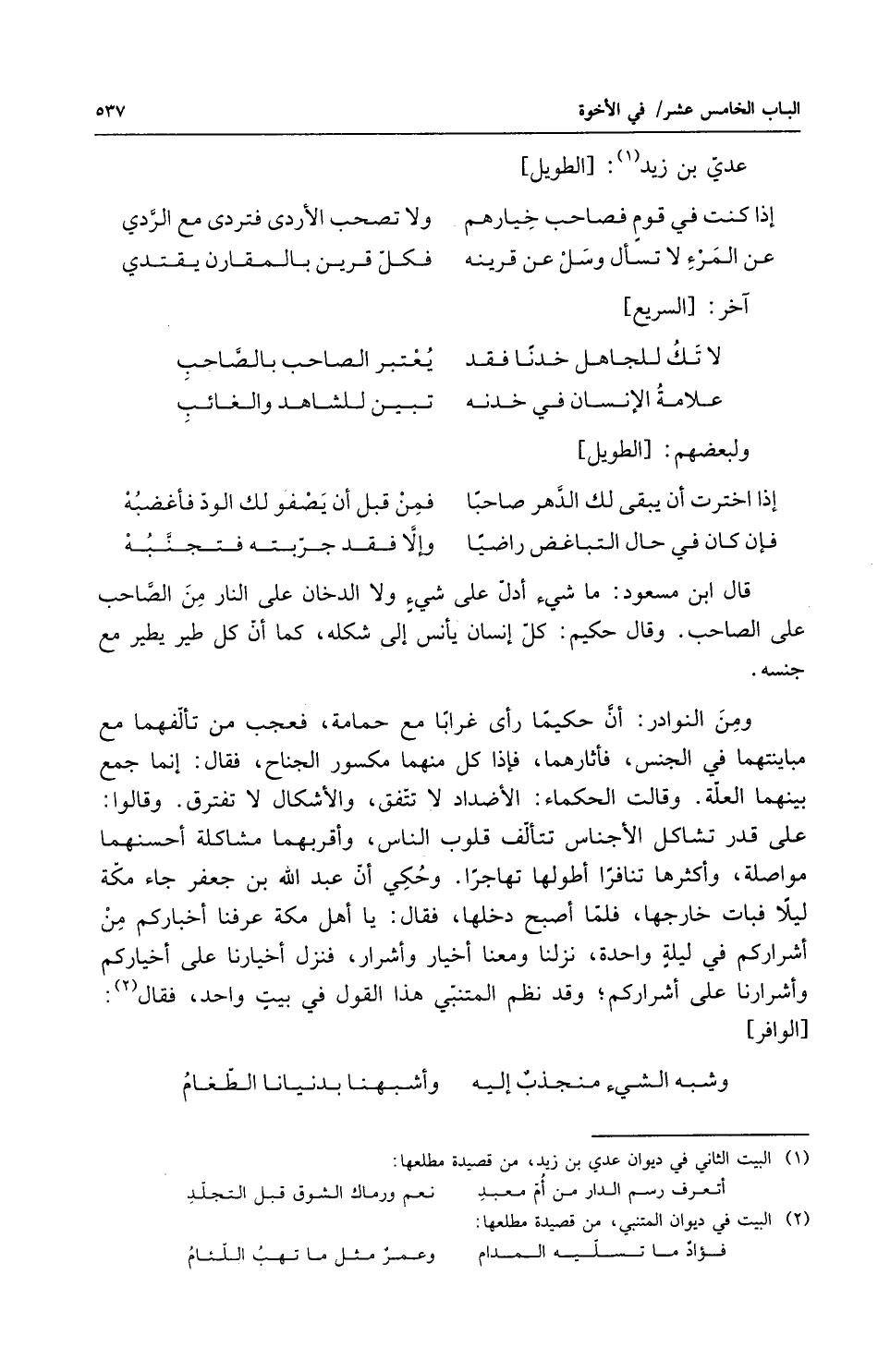قال ابن مسعود ما شيء أدل على شيء ولا الدخان على النار من الصاحب على الصاحب وقال حكيم كل انسان يأنس إلى شكله كما أن كل طير يطير مع جنسه ومن النوادر أن حكيماً رأى غراباً مع حمامة فعجب من تألفهما مع مباينتهما في الجنس فأثارهما فإذا كل منهما مكسورا الجناح فقال إنما جمع بينهما العلة وقالت الحكماء الأضداد لا تتفق والأشكال لا تفترق وقالوا على قدر تشاكل الأجناس تتألف قلوب الناس وأقربهما مشاكلة أحسنهما مواصلة وأكثرها تنافراً أطولها تهاجراً وحكى أن عبد الله بن جعفر جاء مكة ليلاً فبات خارجها فلما أصبح دخلها فقال يا أهل مكة عرفنا أخياركم من أشراركم في ليلة واحدة نزلنا ومعنا أخيار وأشرار فنزل أخيارنا على أخياركم وأشرارنا على أشراركم وقد نظم المتنبي هذا القول في بيت واحد فقال