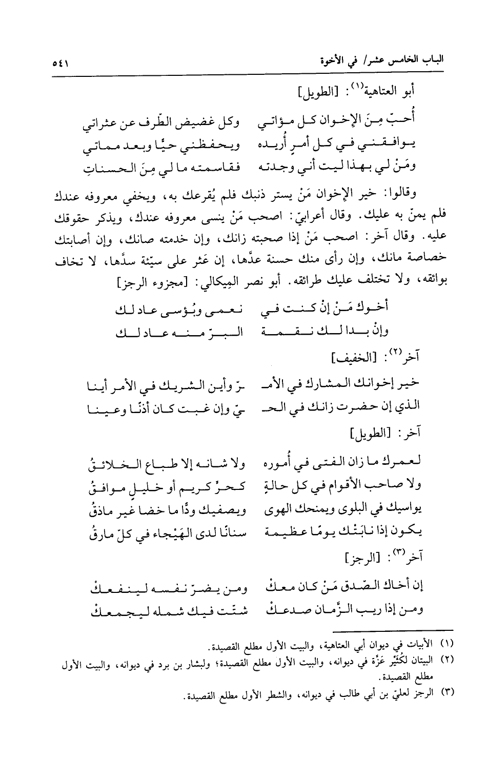 وقالوا خير الاخوان من يستر ذنبك فلم يقرعك به ويخفي معروفه عندك فلم يمن به عليك وقال أعرابي أصحب من ينسى معروفه عندك ويذكر حقوقك عليه وقال آخر أصحب من إذا صحبته زانك وإن خدمته صانك وإن أصابتك خصاصة مانك وإن رأى منك حسنة عدها وإن عثر على سيئة سدها لا تخاف بوائقه ولا تختلف عليك طرائقه أبو نصر الميكالي