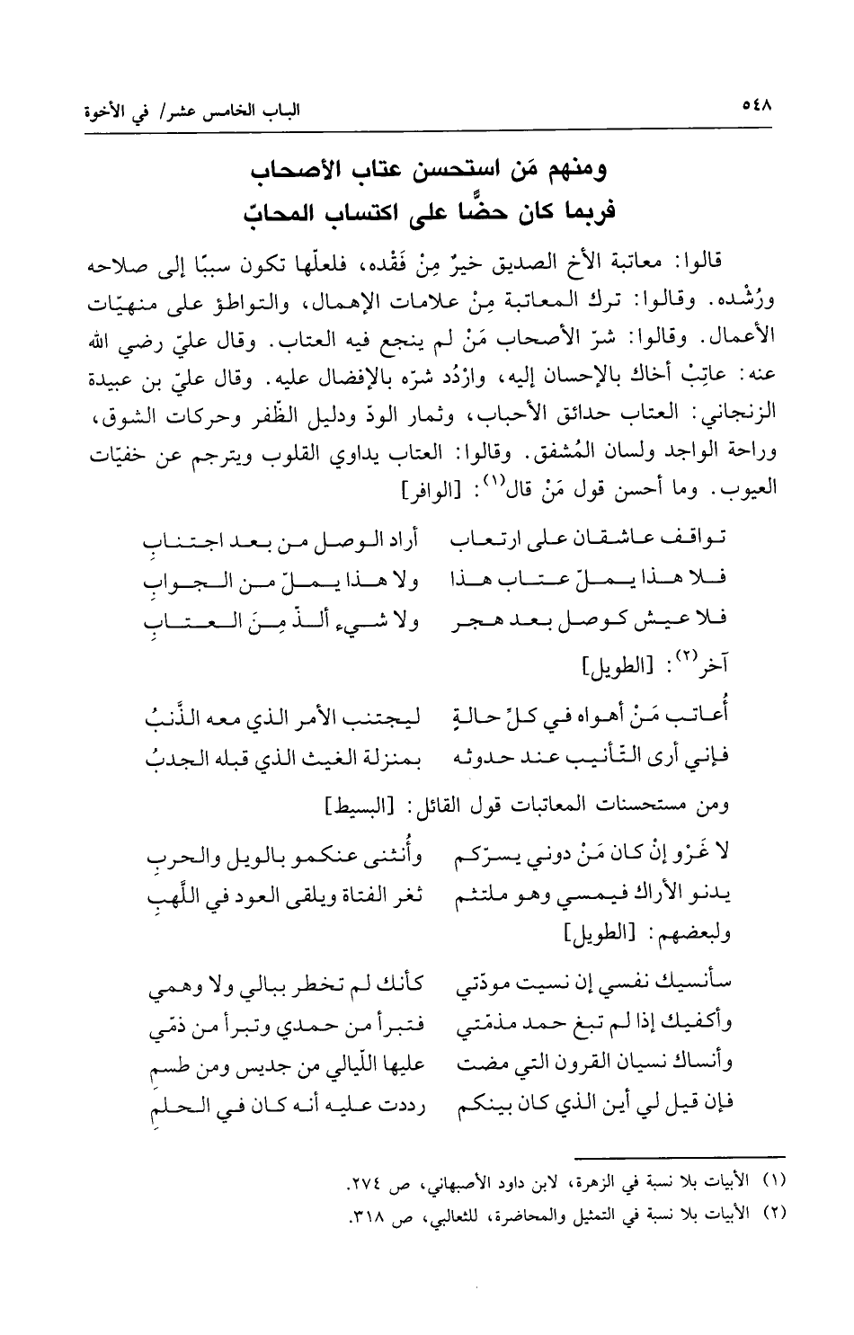 ومنهم من استحسن عتاب الأصحاب ... فربما كان حضا على اكتساب المحابّ