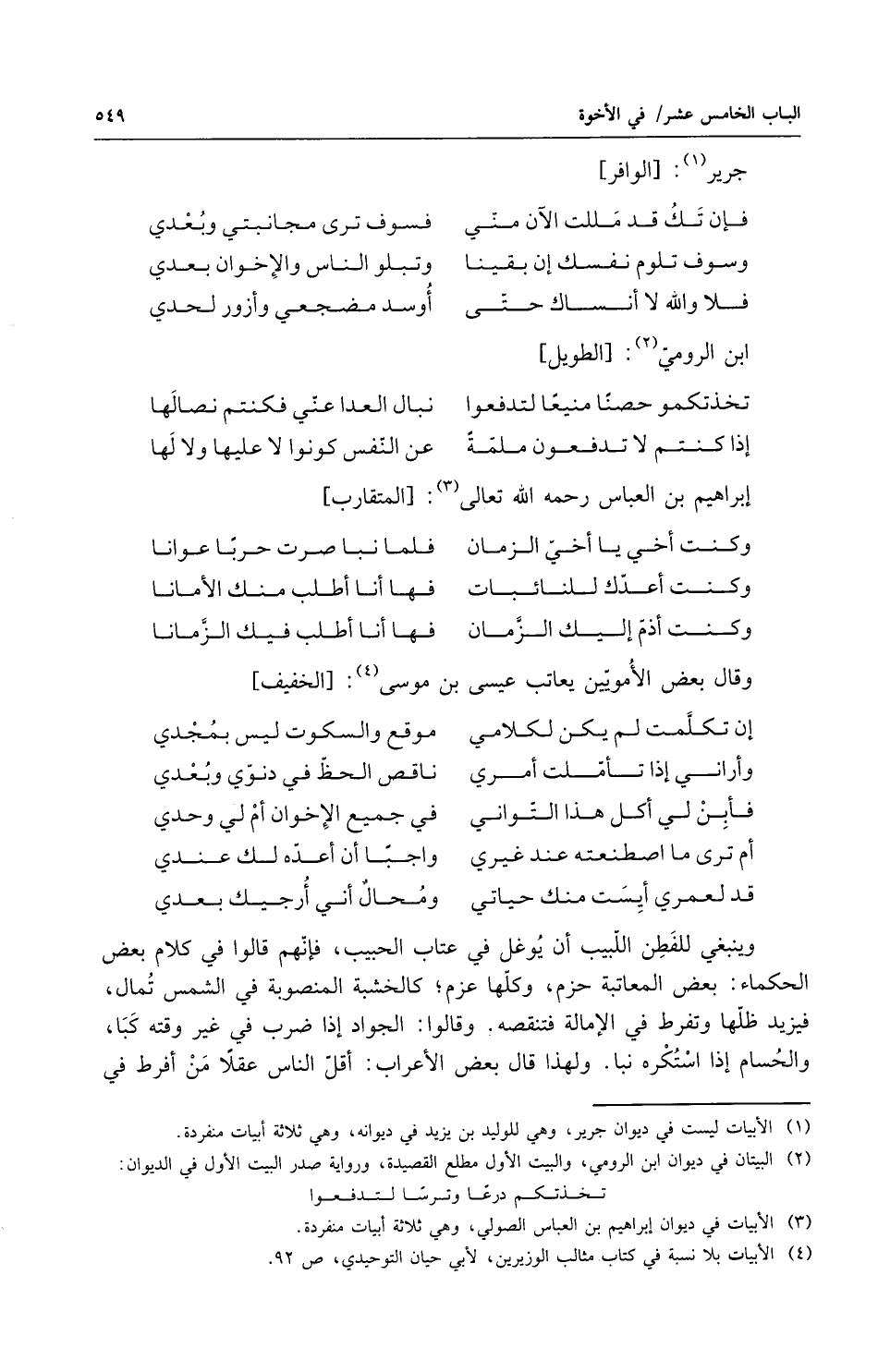 وينبغي للفطن اللبيب أن لا يوغل في عتاب الحبيب فإنهم قالوا في كلام بعض الحكماء بعض المعاتبة حزم وكلها عزم كالخشبة المنصوبة في الشمس تمال فيزيد ظلها وتفرط في الامالة فتنقصه وقالوا الجواد إذا ضرب في غير وقته كبا والحسام إذا استكره نبا ولهذا قال بعض الأعراب أقل الناس عقلاً من أفرط في