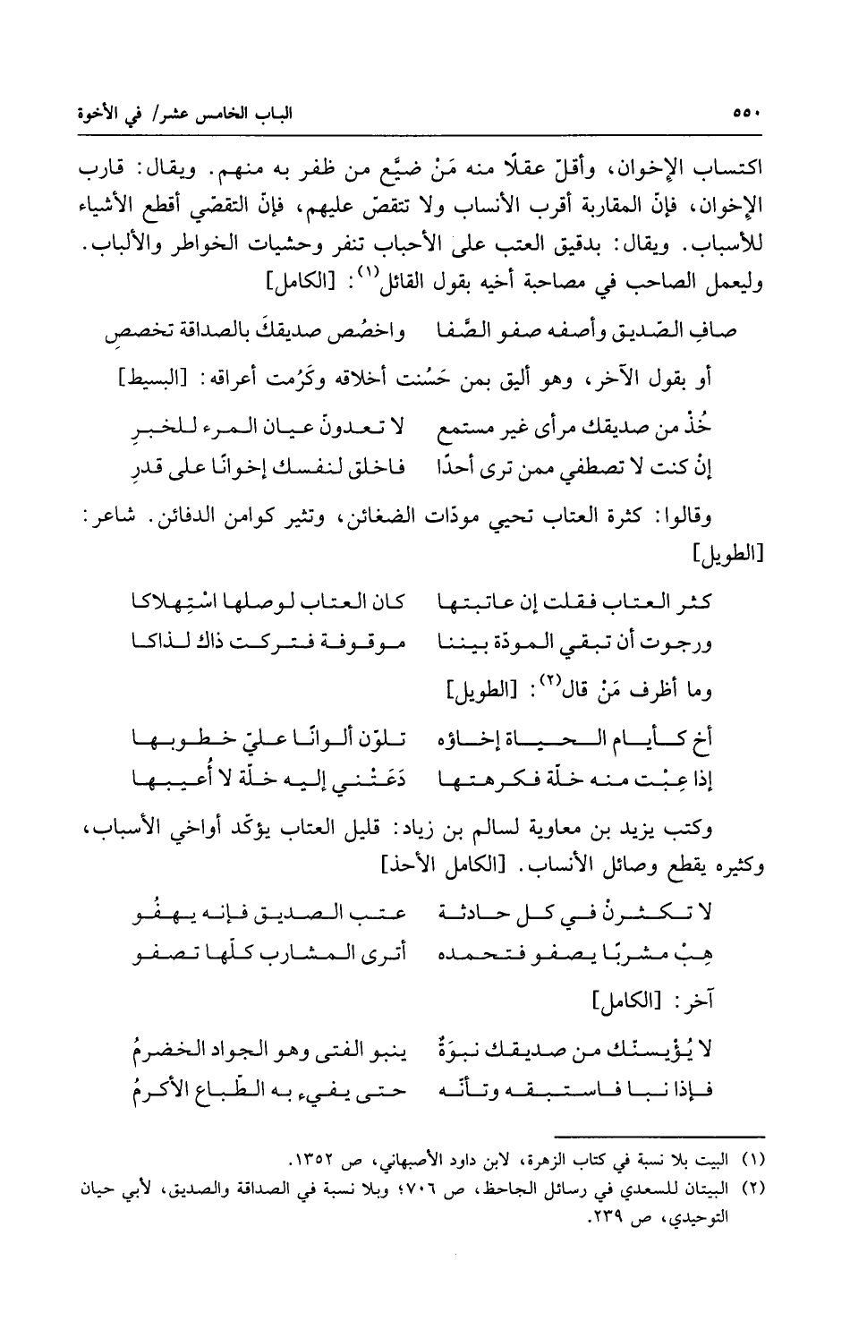اكتساب الاخوان وأقل عقلاً منه من ضيع من ظفر به منهم ويقال قارب الاخوان فإن المقاربة أقرب الأنساب ولا تتقص عليهم فإن التقصي أقطع الأشياء للأسباب ويقال بدقيق العتب على الأحباب تنفر وحشيات الخواطر والألباب وليعمل الصاحب في مصاحبة أخيه يقول القائل