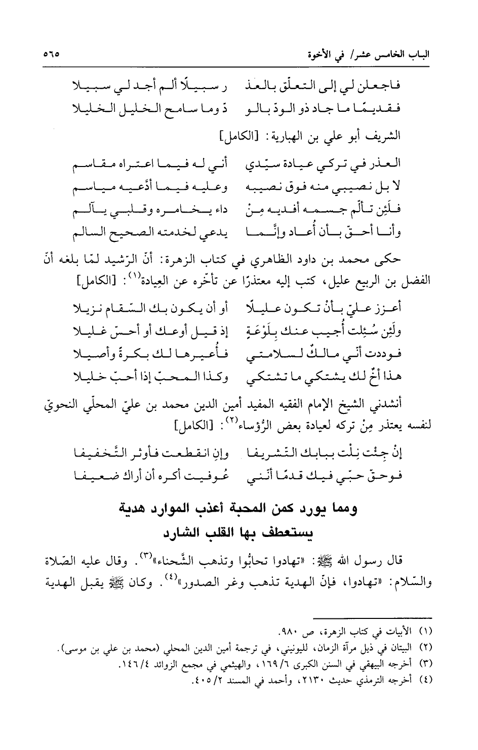 ومما يورد من المحبة أعذب الموارد هدية يستطف بها القلب الشادر قال رسول الله صلى الله عليه وسلم تهادوا تحابوا وتذهب الشحناء وقال عليه الصلاة والسلام تهادوا فإن الهدية تذهب وغر الصدور وكان صلى الله عليه وسلم يقبل الهدية