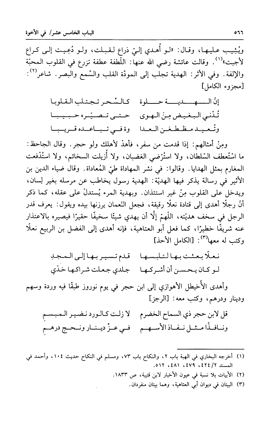 ومن أمثالهم إذا قدمت من سفر فأهد لأهلك ولو حجر وقال الجاحظ ما استعطف السلطان ولا استرضى الغضبان ولا أزيت السخائم ولا استدفعت المغارم بمثل الهدايا وقالوا في نشر المهاداة طي المعاداة وقال ضياء الدين بن الأثير في رسالة يذكر فيها الهدية الهدية رسول يخاطب عن مرسله بغير لسان ويدخل على القلوب من غير استئذان وبهدية المرء يستدل على عقله كما ذكر أن رجلاً أهدى إلى قتادة نعلاً رقيقة فجعل النعمان يرزنها بيده ويقول يعرف قدر الرجل في سخف هديته اللهم إلا أن يهدي شيأً مخيفاً حقيراً فيصيره بالاعتذار عنه شريفاً خطيراً كما فعل أبو العتاهية فإنه أهدى إلى الفضل بن الربيع نعلاً وكتب له معها