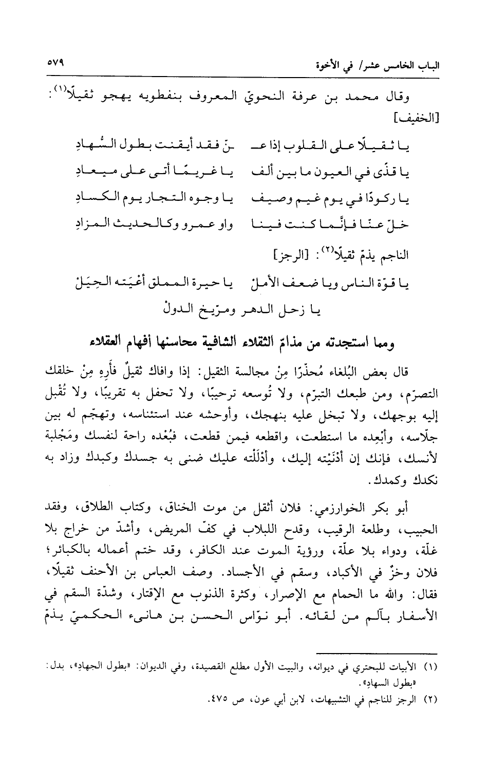 قال بعض البلغاء محذراً من مجالسة الثقيل إذا وافاك ثقيل فأره من خلقك التصرم ومن طبعك التبرم ولا توسعه ترحيباً ولا تحفل به تقريباً ولا تقبل إليه بوجهك ولا تبخل عليه بنهجك وأوحشه عند استئناسه وتهجم له بين جلاسه وأبعده ما استطعت واقطعه فيمن قطعت فبعده راحة لنفسك ومجلبة لأنسك فإنك إن أدنيته إليك وأدللته عليك ضنى به جسدك وكبدك وزاد به نكدك وكمدك أبو بكر الخوارزمي فلان أثقل من موت الخناق وكتاب الطلاق وفقد الحبيب وطلعة الرقيب وقدح اللبلاب في كف المريض وأشد من خراج بلا غلة ودواء بلا علة ورؤية الموت عند الكافر وقد ختم أعماله بالكبائر فلان وخز في الأكباد وسقم في الأجساد وصف العباس ابن الأحنف ثقيلاً فقال والله ما الحمام مع الاصرار وكثرة الذنوب مع الأقتار وشدة السقم في الأسفار بآلم من لقائه أبو نواس الحسن بن هانئ الحكمي يذم