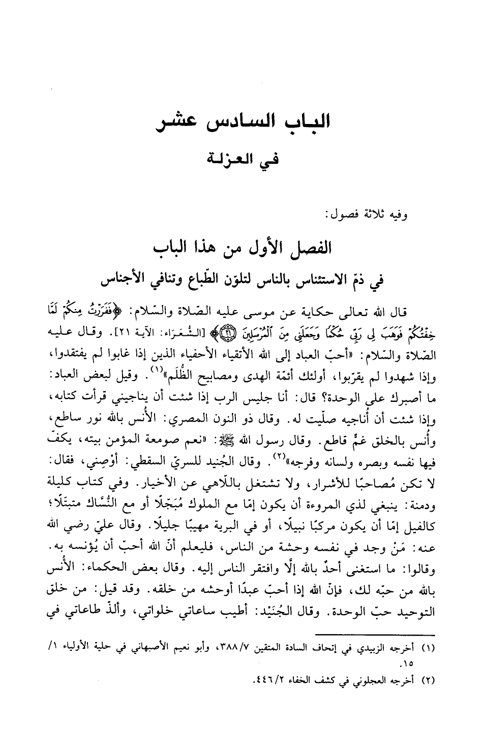 قال الله تعالى حكاية عن موسى عليه الصلاة والسلام ففررت منكم لما خفتكم فوهب لي ربي حكماً وجعلني من المرسلين وقال عليه الصلاة والسلام أحب العباد إلى الله الأتقياء الأحفياء الذين إذا غابوا لم يفتقدوا وإذا شهدوا لم يقربوا أولئك أئمة الهدى ومصابيح الظلم وقيل لبعض العباد ما أصبرك على الوحدة قال أنا جليس الرب إذا شئت أن يناجيني قرأت كتابه وإذا شئت أن أناجيه صليت له وقال ذو النون المصري الأنس بالله نور ساطع والأنس بالخلق غم قاطع وقال رسول الله صلى الله عليه وسلم نعم صومعة المؤمن بيته يكف فيها نفسه وبصره ولسانه وفرجه وقال الجنيد للسري السقطي أوصني فقال لا تكن مصاحباً للأشرار ولا تشتغل باللاهي عن الأخيار وفي كتاب كليلة ودمنة ينبغي لذي المروءة أن يكون إما مع الملوك مبجلاً أو مع النساك متبتلا كالفيل إما أن يكون مركباً نبيلاً أو في البرية مهيباً جليلاً وقال علي رضي الله عنه من وجد في نفسه وحشة من الناس فليعلم أن الله أحب أن يؤنسه به وقالوا ما استغنى أحد بالله إلا وافتقر الناس إليه وقال بعض الحكماء الأنس بالله من حبه لك فإن الله إذا أحب عبداً أوحشه من خلقه وقد قيل من خلق التوحيد حب الوحدة وقال الجنيد أطيب ساعاتي خلواتي وألذ طاعاتي في