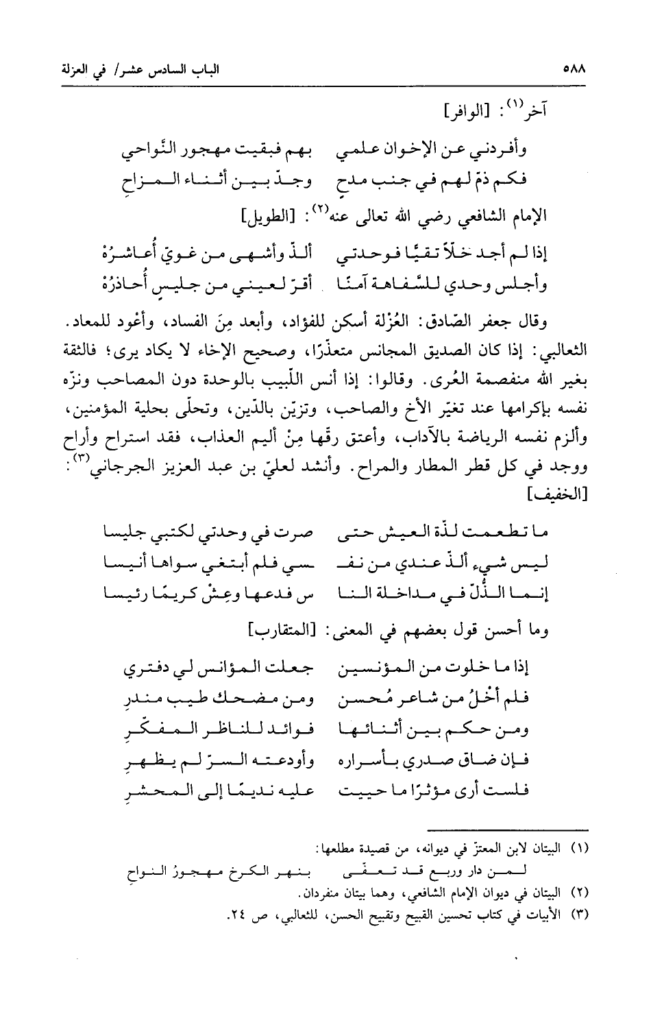 وقال جعفر الصادق العزلة أسكن للفؤاد وأبعد من الفساد وأعود للمعاد الثعالبي إذا كان الصديق المجانس متعذراً وصحيح الأخاء لا يكاد يرى فالثقة بغير الله منفصمة العرى وقالوا إذا أنس اللبيب بالوحدة دون المصاحب ونزه نفسه باكرامها عند تغير الأخ والصاحب وتزين بالدين وتحلى بحلية المؤمنين وألزم نفسه الرياضة بالآداب وأعتق رقها من أليم العذاب فقد استراح وأراح ووجد في كل قطر المطار والمراح وأنشد لعلي بن عبد العزيز الجرجاني