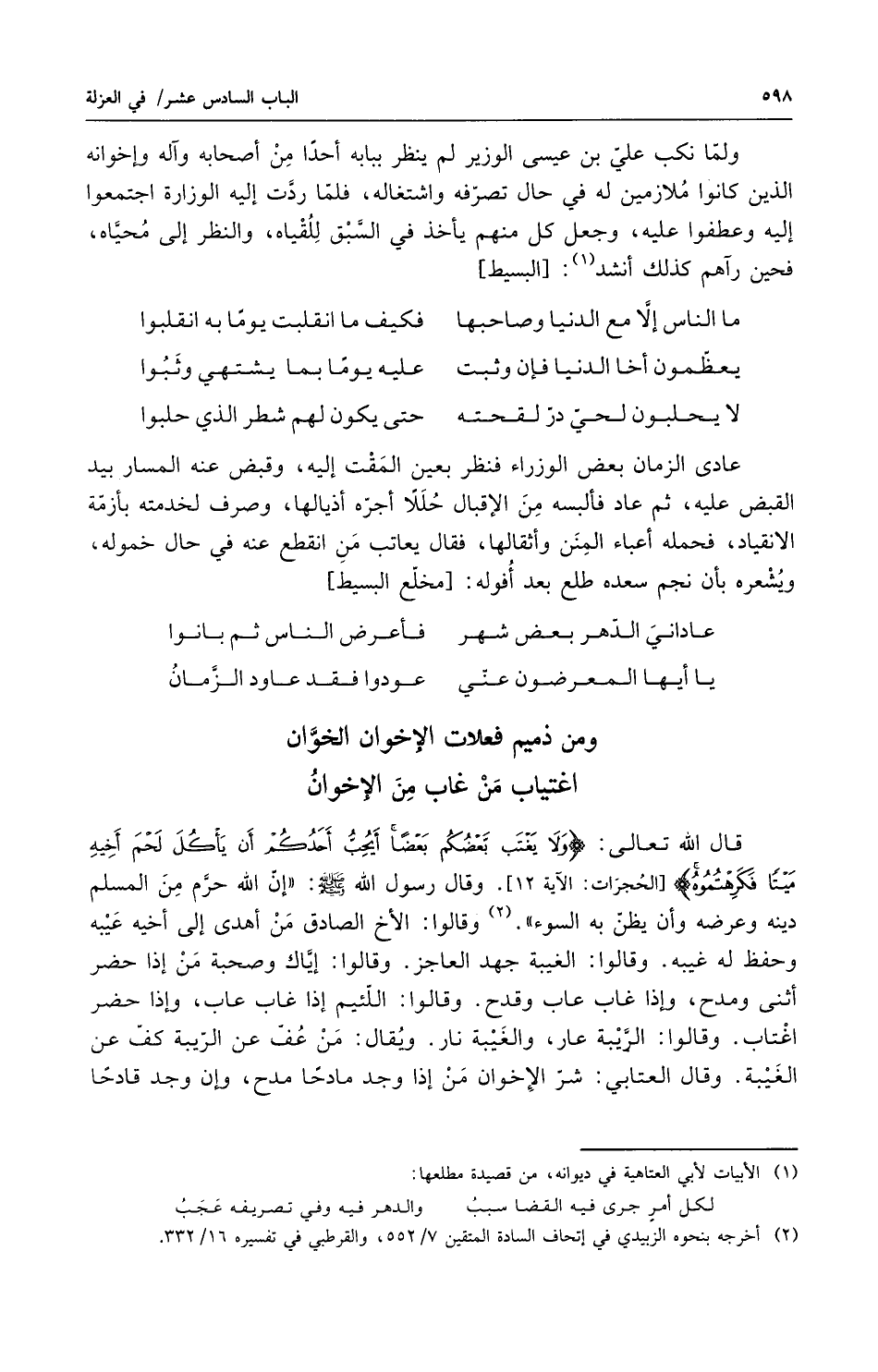قال الله تعالى ولا يغتب بعضكم بعضاً أيحب أحدكم أن يأكل لحم أخيه ميتاً فكرهتموه وقال رسول الله صلى الله عليه وسلم إن الله حرم من المسلم دينه وعرضه وأن يظن به السوء وقالوا الأخ الصادق من أهدى إلى أخيه عيبه وحفظ له غيبه وقالوا الغيبة جهداً لعاجز وقالوا إياك وصحبة من إذا حضر أثنى ومدح وإذا غاب عاب وقدح وقالوا اللئيم إذا غاب عاب وإذا حضر اغتاب وقالوا الريبة عار والغيبة نار ويقال من عف عن الريبة كف عن الغيبة وقال العتابي شر الاخوان من إذا وجد مادحاً مدح وإن وجد قادحاً