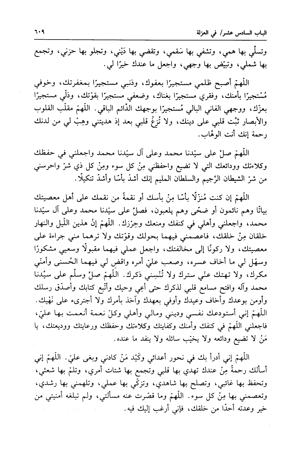 أهل معصيتك بيتاً وهم نائمون أو ضحى وهم يلعبون فصل على سيدنا محمد وعلى آل سيدنا محمد واجعلني وأهلي في كنفك ومنعك وحرزك اللهم إن هذين الليل والنهار خلقان من خلقك فاعصمني فيهما بحولك وقونك ولا ترهما مني جراءة على معصيتك ولا ركونا إلى مخالفتك واجعل عملي فيهما مقبولاً وسعي مشكوراً وسهل لي ما أخاف عسره وصعب على أمره واقض لي فيهما بالحسنى وامني مكرك ولا تهتك عني سترك ولا تنسني ذكرك اللهم صلى الله عليه وآله وسلم على سيدنا محمد وآله وافتح مسامع قلبي لذكرك حتى أعي وجيك وأتبع كتابك وأصدق رسلك وأومن بوعدك وأخاف وعيدك وأوفي بعهدك وآخذ بأمرك ولا اجترئ على نهيك اللهم إني أستودعك نفسي وديني ومالي وأهلي وكل نعمة أنعمت بها علي فاجعلني اللهم في كنفك وأمنك وكفايتك وكلاءتك وحفظك ورعايتك ووديعتك يا من لا تضيع ودائعه ولا يخيب سائله ولا ينفد ما عنده اللهم إني أدر أبك في نحور أعدائي وكيد من كادني وبغى علي اللهم إني أسألك رحمة من عندك تهدي بها قلبي وتجمع بها شتات أمري وتلم بها شعثي وتحفظ بها غائبي وتصلح بها شاهدي وتزكي بها عملي وتلهمني بها رشدي وتعصمني بها من كل سوء اللهم وما قصرت عنه مسئلتي ولم تبلغه أمنيتي من خير وعدته أحداً من خلقك فإني أرغب إليك فيه