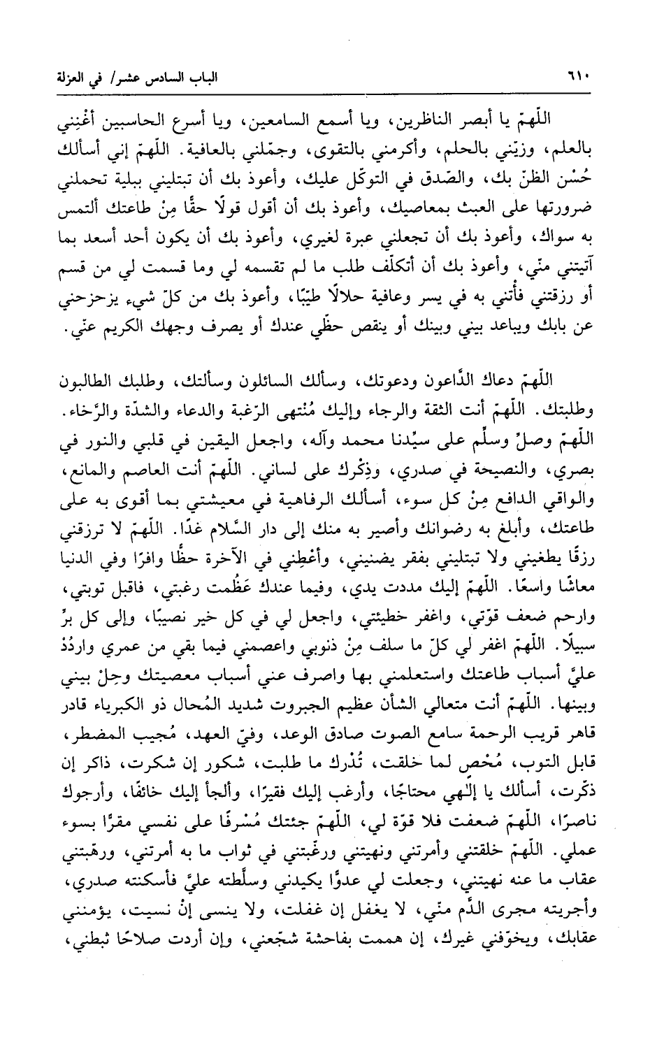 اللهم يا أبصر الناظرين ويا أسمع السامعين ويا أسرع الحاسبين أغنني بالعلم وزيني بالحلم وأكرمني بالتقوى وجملني بالعافية اللهم إني أسألك حسن الظن بك والصدق في التوكل عليك وأعوذ بك أن تبتليني ببلية تحملني ضرورتها على العبث بمعاصيك وأعوذ بك أن أقول قولاً حقاً من طاعتك ألتمس به سواك وأعوذ بك أن تجعلني عبرة لغيري وأعوذ بك أن يكون أحد أسعد بما آتيتني مني وأعوذ بك أن أتكلف طلب ما لم تقسمه لي وما قسمت لي من قسم أو رزقتني من رزق فأتني به في يسر وعافية حلالاً طيباً وأعوذ بك من كل شيء يزحزحني عن بابك ويباعد بيني وبينك أو ينقص حظي عندك أو يصرف وجهك الكريم عني اللهم دعاك الداعون ودعوتك وسألك السائلون وسألتك وطلبك الطالبون وطلبتك اللهم أنت الثقة والرجاء وإليك منتهى الرغبة والدعاء والشدة والرخاء اللهم وصل وسلم على سيدنا محمد وآله واجعل اليقين في قلبي والنور في بصري والنصيحة في صدري وذكرك على لساني اللهم أنت العاصم والمائع والواقي الدافع من كل سوء أسألك الرفاهية في معيشتي بما أقوى به على طاعتك وأبلغ به رضوانك وأصير به منك إلى دار السلام غدا اللهم لا ترزقني رزقاً يطغيني ولا تبتليني بفقر يضنيني وأعطني في الآخرة حظاً وافراً وفي الدنيا معاشاً واسعاً اللهم إليك مددت يدي وفيما عندك عظمت رغبتي فأقبل توبتي وارحم ضعف قوتي واغفر خطيئتي واجعل لي في كل خير نصيباً وإلى كل بر سبيلاً اللهم اغفر لي كل ما سلف من ذنوبي واعصمني فما بقي من عمري واردد علي أسباب طاعتك واستعملني بها واصرف عني أسباب معصيتك وحل بيني وبينها اللهم أنت متعالي الشأن عظيم الجبروت شديد المحال ذو الكبرياء قادر قاهر قريب الرحمة سامع الصوت صادق الوعد وفي العهد مجيب المضطر قابل التوب محص لما خلقت تدرك ما طلبت شكور إن شكرت ذاكر إن ذكرت أسألك يا إلهي محتاجاً وأرغب إليك فقيراً وألجأ إليك خائفاً وأرجوك ناصراً اللهم ضعفت فلا قوة لي اللهم جئتك مسرفاً على نفسي مقراً بسوء عملي اللهم خلقتني وأمرتني ونهيتني ورغبتني في ثواب ما به أمرتني ورهبتني عقاب ما عنه نهيتني وجعلت لي عدواً يكيدني وسلطته علي فأسكنته صدري وأجريته مجرى الدم مني لا يغفل إن غفلت ولا ينسى إن نسيت يؤمنني عقابك ويخوفني غيرك إن هممت بفاحشة شجعني وإن أردت صلاحاً ثبطني
