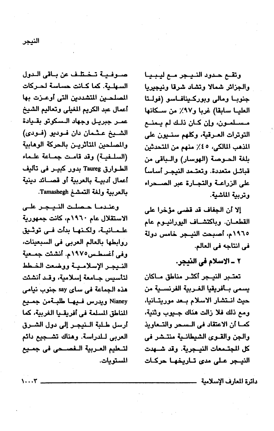 وعندما حصلت النيجر على الاستقلال عام 1960 م، كانت جمهورية علمانية، ولكنها بدأت فى توثيق روابطها بالعالم العربى فى السبعينات، وفى أغسطس 1975 م. أنشئت جمعية النيجر الإسلامية ووضعت الخطط لتأسيس جامعة إسلامية، وقد أنشئت هذه الجامعة فى ساى say جنوب نيامى Nianey ويدرس فيها طلبة من جميع المناطق المسلمة فى أفريقيا الغربية، كما أرسل طلبة النيجر إلى دول الشرق العربى للدراسة. وهناك تشجيع دائم لتعليم العربية الفصحى فى جميع المستويات.