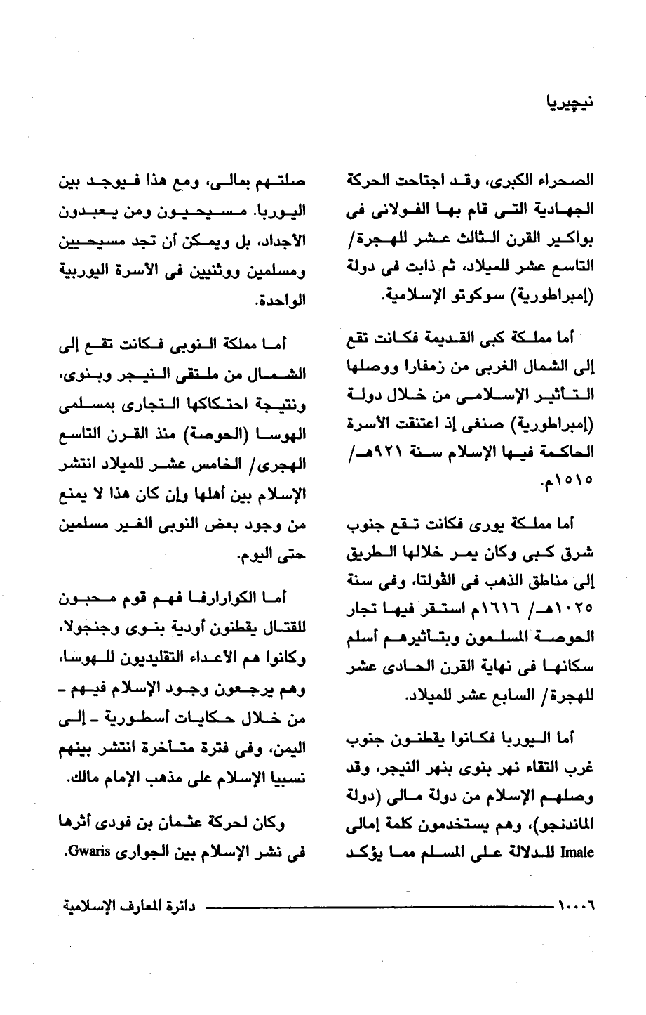 الصحراء الكبرى، وقد اجتاحت الحركة الجهادية التى قام بها الفولانى فى بواكير القرن الثالث عشر للهجرة/ التاسع عشر للميلاد، ثم ذابت فى دولة (إمبراطورية) سوكوتو الإسلامية.