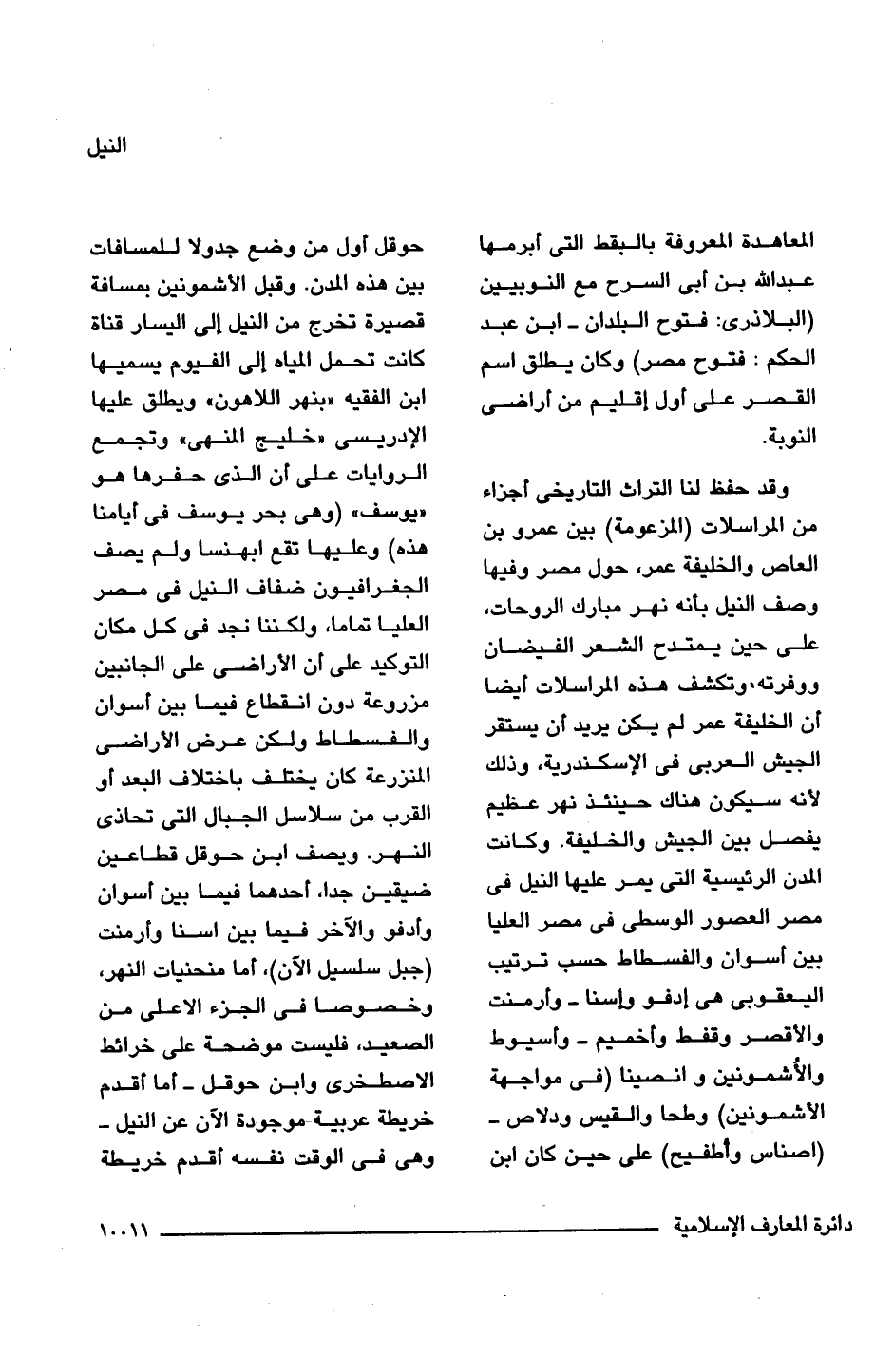 وقد حفظ لنا التراث التاريخى أجزاء من المراسلات (المزعومة) بين عمرو بن العاص والخليفة عمر، حول مصر وفيها وصف النيل بأنه نهر مبارك الروحات، على حين يمتدح الشعر الفيضان ووفرته؛ وتكشف هذه المراسلات أيضا أن الخليفة عمر لم يكن يريد أن يستقر الجيش العربى فى الإسكندرية، وذلك لأنه سيكون هناك حينئذ نهر عظيم يفصل بين الجيش والخليفة. وكانت المدن الرئيسية التى يمر عليها النيل فى مصر العصور الوسطى فى مصر العليا بين أسوان والفسطاط حسب ترتيب اليعقوبى هى إدفو وإسنا -وأرمنت والأقصر وقفط وأخميم- وأسيوط والأُشمونين وانصينا (فى مواجهة الأشمونين) وطحا والقيس ودلاص - (أصناس وأطفيح) على حين كان ابن حوقل أول من وضع جدولا للمسافات بين هذه المدن. وقبل الأشمونين بمسافة قصيرة تخرج من النيل إلى اليسار قناة كانت تحمل المياه إلى الفيوم يسميها ابن الفقيه "بنهر اللاهون" ويطلق عليها الإدريسى "خليج المنهى" وتجمع الروايات على أن الذى حفرها هو "يوسف" (وهى بحر يوسف فى أيامنا هذه) وعليها تقع ابهنسا ولم يصف الجغرافيون ضفاف النيل فى مصر العليا تماما، ولكننا نجد فى كل مكان التوكيد على أن الأراضى على الجانبين مزروعة دون انقطاع فيما بين أسوان والفسطاط ولكن عرض الأراضى المنزرعة كان يختلف باختلاف البعد أو القرب من سلاسل الجبال التى تحاذى النهر. ويصف ابن حوقل قطاعين ضيقين جدا، أحدهما فيما بين أسوان وأدفو والآخر فيما بين إسنا وأرمنت (جبل سلسيل الآن)، أما منحنيات النهر، وخصوصا فى الجزء الأعلى من الصعيد، فليست موضحة على خرائط الاصطخرى وابن حوقل -أما أقدم خريطة عربية موجودة الآن عن النيل- وهى فى الوقت نفسه أقدم خريطة