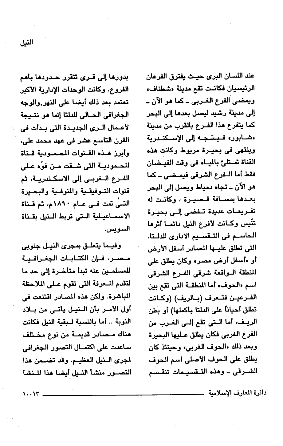 عند اللسان البرى حيث يفترق الفرعان الرئيسيان فكانت تقع مدينة "شطناف" ويمضى الفرع الغربى -كما هو الآن- إلى مدينة رشيد ليصل بعدها إلى البحر كما يتفرع هذا الفرع بالقرب من مدينة "شابور" فيتجه إلى الإسكندرية وينتهى فى بحيرة مريوط وكانت هذه القناة تمتلئ بالمياه فى وقت الفيضان فقط أما الفرع الشرقى فيمضى -كما هو الآن- تجاه دمياط ويصل إلى البحر بعدها بمسافة قصيرة، وكانت له تفريعات عديدة تفضى إلى بحيرة تنّيس وكانت لأفرع النيل دائما أثرها الحاسم فى التقسيم الادارى للدلتا، التى تطلق عليها المصادر أسفل الأرض أو "أسفل أرض مصر" وكان يطلق على المنطقة الواقعة شرقى الفرع الشرقى اسم "الحوف" أما المنطقة التى تقع بين الفرعين فتعرف (بالريف) (وكانت تطلق أحيانا على الدلتا بأكملها) أو بطن الريف، أما التى تقع إلى الغرب من الفرع الغربى فكان يطلق عليها البحيرة وبعد ذلك "الحوف الغربى" وحينئذ كان يطلق على الحوف الأصلى اسم الحوف الشرقى -وهذه التقسيمات تنقسم بدورها إلى قرى تتقرر حدودها بأهم الفروع، وكانت الوحدات الإدارية الأكبر تعتمد بعد ذلك أيضا على النهر. والوجه الجغرافى الحالى للدلتا إنما هو نتيجة لأعمال الرى الجديدة التى بدأت فى القرن التاسع عشر فى عهد محمد على، وأبرز هذه القنوات المحمودية قناة المحمودية التى شقت من فوّه على الفرع الغربى إلى الاسكندرية، ثم قنوات التوفيقية والمنوفية والبحيرة التى تمت فى عام 1890 م، ثم قناة الإسماعيلية التى تربط النيل بقناة السويس.