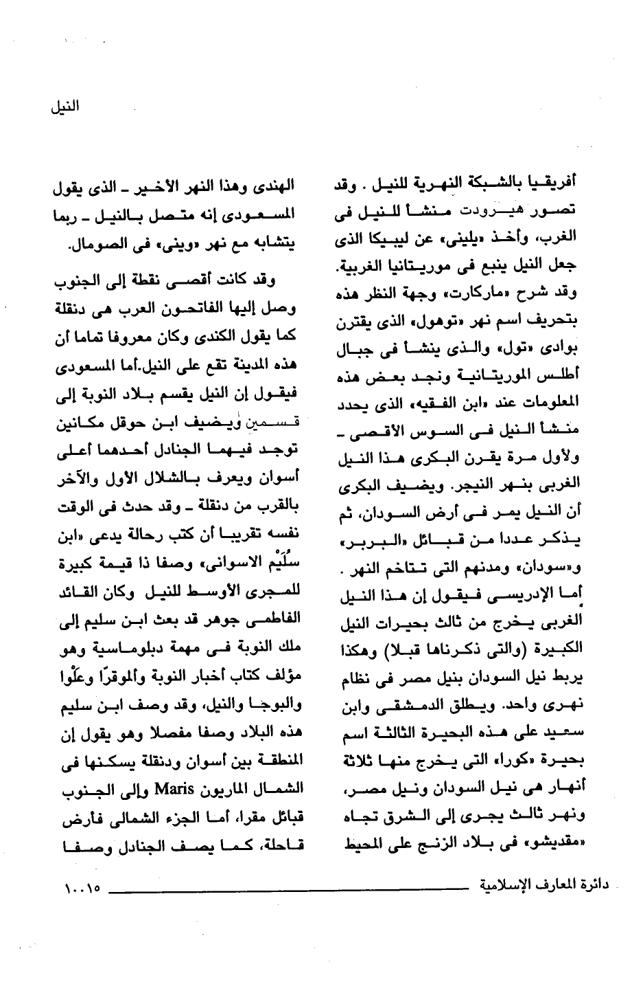 أفريقيا بالشبكة النهرية للنيل. وقد تصور هيرودت منشأ للنيل فى الغرب، وأخذ "يلينى" عن ليبيكا الذى جعل النيل ينبع فى موريتانيا الغربية. وقد شرح "ماركارت" وجهة النظر هذه بتحريف اسم نهر "توهول" الذى يقترن بوادى "تول" والذى ينشأ فى جبال أطلس الموريتانية ونجد بعض هذه المعلومات عند "ابن الفقيه" الذى يحدد منشأ النيل فى السوس الأقصى -ولأول مرة يقرن البكرى هذا النيل الغربى بنهر النيجر. ويضيف البكرى أن النيل يمر فى أرض السودان، ثم يذكر عددا من قبائل "البربر" و"سودان " ومدنهم التى تتاخم النهر. أما الإدريسى فيقول إن هذا النيل الغربى يخرج من ثالث بحيرات النيل الكبيرة (والتى ذكرناها قبلا) وهكذا يربط نيل السودان بنيل مصر فى نظام نهرى واحد. ويطلق الدمشقى وابن سعيد على هذه البحيرة الثالثة اسم بحيرة "كورا" التى يخرج منها ثلاثة أنهار هى نيل السودان ونيل مصر، ونهر ثالث يجرى إلى الشرق تجاه "مقديشو" فى بلاد الزنج على المحيط الهندى وهذا النهر الأخير -الذى يقول المسعودى إنه متصل بالنيل- ربما يتشابه مع نهر "وينى" فى الصومال.