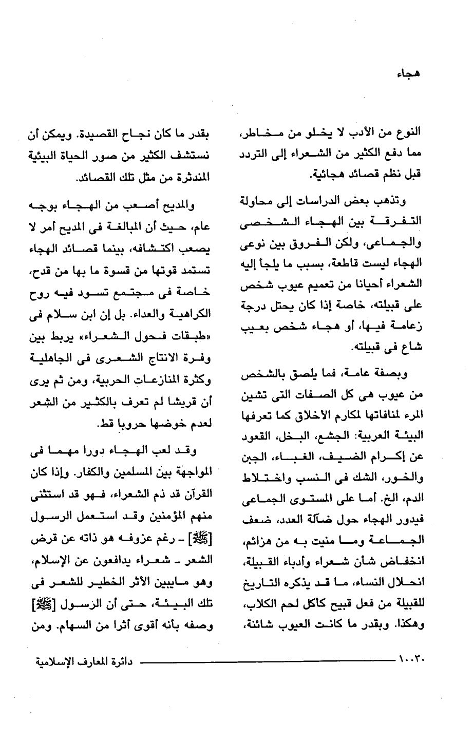 وقد لعب الهجاء دورا مهما فى المواجهة بين المسلمين والكفار. وإذا كان القرآن قد ذم الشعراء، فهو قد استثنى منهم المؤمنين وقد استعمل الرسول [-صلى اللَّه عليه وسلم-] رغم عزوفه هو ذاته عن قرض الشعر - شعراء يدافعون عن الإسلام، وهو ما يبين الأثر الخطير للشعر فى تلك البيئة، حتى أن الرسول [-صلى اللَّه عليه وسلم-] وصفه بأنه أقوى أثرا من السهام. ومن