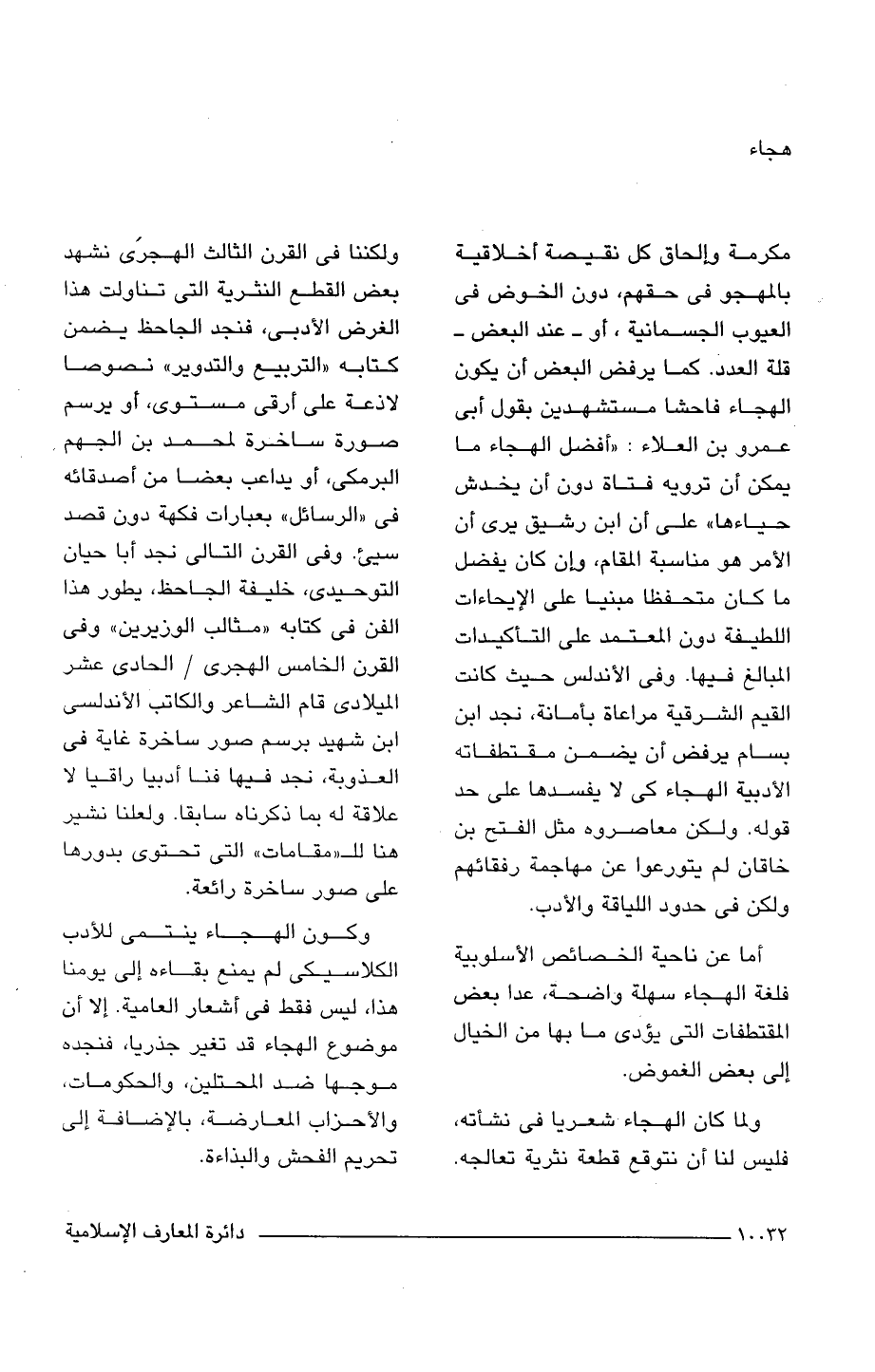 مكرمة وإلحاق كل نقيصة أخلاقية بالمهجو فى حقهم، دون الخوض فى العيوب الجسمانية، أو -عند البعض- قلة العدد. كما يرفض البعض أن يكون الهجاء فاحشا مستشهدين بقول أبى عمرو بن العلاء: "أفضل الهجاء ما يمكن أن ترويه فتاة دون أن يخدش حياءها" على أن ابن رشيق يرى أن الأمر هو مناسبة المقام، وإن كان يفضل ما كان متحفظا مبنيا على الإيحاءات اللطيفة دون المعتمد على التأكيدات المبالغ فيها. وفى الأندلس حيث كانت القيم الشرقية مراعاة بأمانة، نجد ابن بسام يرفض أن يضمن مقتطفاته الأدبية الهجاء كى لا يفسدها على حد قوله. ولكن معاصروه مثل الفتح بن خاقان لم يتورعوا عن مهاجمة رفقائهم ولكن فى حدود اللياقة والأدب.