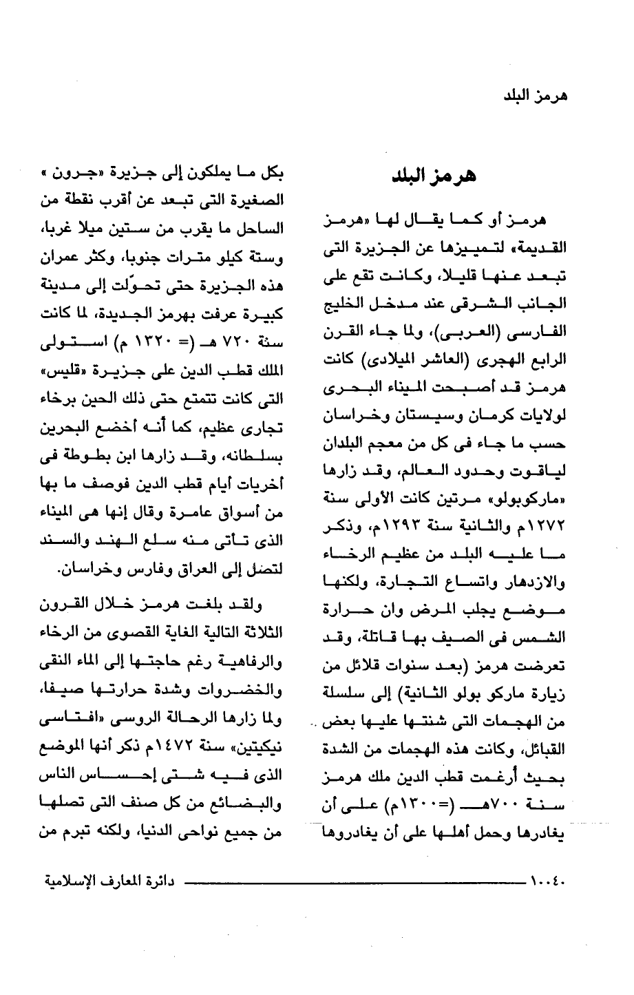 هرمز أو كما يقال لها "هرمز القديمة" لتمييزها عن الجزيرة التى تبعد عنها قليلا، وكانت تقع على الجانب الشرقى عند مدخل الخليج الفارسى (العربى)، ولما جاء القرن الرابع الهجرى (العاشر الميلادى) كانت هرمز قد أصبحت الميناء البحرى لولايات كرمان وسيستان وخراسان حسب ما جاء فى كل من معجم البلدان لياقوت وحدود العالم، وقد زارها "ماركوبولو" مرتين كانت الأولى سنة 1272 م والثانية سنة 1293 م، وذكر ما عليه البلد من عظيم الرخاء والازدهار واتساع التجارة، ولكنها موضع يجلب المرض وإن حرارة الشمس فى الصيف بها قاتلة، وقد تعرضت هرمز (بعد سنوات قلائل من زيارة ماركو بولو الثانية) إلى سلسلة من الهجمات التى شنتها عليها بعض القبائل، وكانت هذه الهجمات من الشدة بحيث أرغمت قطب الدين ملك هرمز سنة 700 هـ (= 1300 م) على أن يغادرها وحمل أهلها على أن يغادروها بكل ما يملكون إلى جزيرة "جرون" الصغيرة التى تبعد عن أقرب نقطة من الساحل ما يقرب من ستين ميلا غربا، وستة كيلو مترات جنوبا، وكثر عمران هذه الجزيرة حتى تحوّلت إلى مدينة كبيرة عرفت بهرمز الجديدة، لما كانت سنة 720 هـ (= 1320 م) استولى الملك قطب الدين على جزيرة "قليس" التى كانت تتمتع حتى ذلك الحين برخاء تجارى عظيم، كما أنه أخضع البحرين بسلطانه، وقد زارها ابن بطوطة فى أخريات أيام قطب الدين فوصف ما بها من أسواق عامرة وقال إنها هى الميناء الذى تأتى منه سلع الهند والسند لتصل إلى العراق وفارس وخراسان.