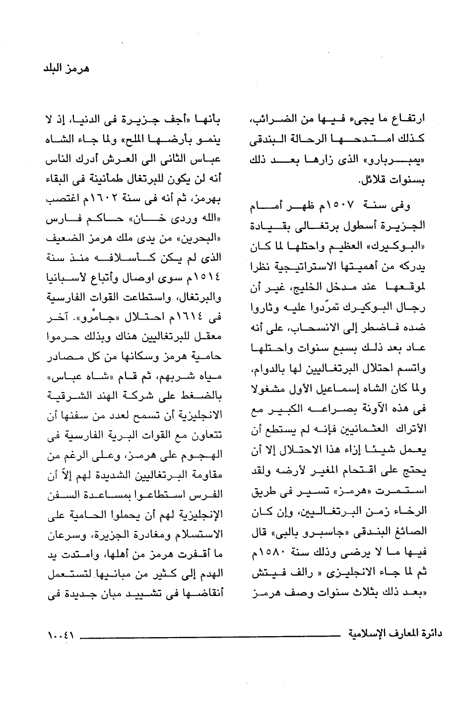 وفى سنة 1507 م ظهر أمام الجزيرة أسطول برتغالى بقيادة "البوكيرك" العظيم واحتلها لما كان يدركه من أهميتها الاستراتيجية نظرا لموقعها عند مدخل الخليج، غير أن رجال البوكيرك تمرَّدوا عليه وثاروا ضده فاضطر إلى الانسحاب، على أنه عاد بعد ذلك بسبع سنوات واحتلها واتسم احتلال البرتغاليين لها بالدوام، ولما كان الشاه إسماعيل الأول مشغولا فى هذه الآونة بصراعه الكبير مع الأتراك العثمانيين فإنه لم يستطع أن يعمل شيئا إزاء هذا الاحتلال إلا أن يحتج على اقتحام المغير لأرضه ولقد استمرت "هرمز" تسير فى طريق الرخاء زمن البرتغاليين، وإن كان الصائغ البندقى "جاسبرو بالبى" قال فيها ما لا يرضى وذلك سنة 1580 م ثم لما جاء الانجليزى "رالف فيتش" بعد ذلك بثلاث سنوات وصف هرمز بأنها "أجف جزيرة فى الدنيا، إذ لا ينمو بأرضها الملح" ولما جاء الشاه عباس الثانى إلى العرش أدرك الناس أنه لن يكون للبرتغال طمأنينة فى البقاء بهرمز، ثم أنه فى سنة 1602 م اغتصب "اللَّه وردى خان" حاكم فارس "البحرين" من يدى ملك هرمز الضعيف الذى لم يكن كأسلافه منذ سنة 1514 م سوى أوصال وأتباع لأسبانيا والبرتغال، واستطاعت القوات الفارسية فى 1614 م احتلال "جامْرو". آخر معقل للبرتغاليين هناك وبذلك حرموا حامية هرمز وسكانها من كل مصادر مياه شربهم، ثم قام "شاه عباس" بالضغط على شركة الهند الشرقية الانجليزية أن تسمح لعدد من سفنها أن تتعاون مع القوات البرية الفارسية فى الهجوم على هرمز، وعلى الرغم من مقاومة البرتغاليين الشديدة لهم إلّا أن الفرس استطاعوا بمساعدة السفن الإنجليزية لهم أن يحملوا الحامية على الاستسلام ومغادرة الجزيرة، وسرعان ما أقفرت هرمز من أهلها، وامتدت يد الهدم إلى كثير من مبانيها لتستعمل أنقاضها فى تشييد مبان جديدة فى