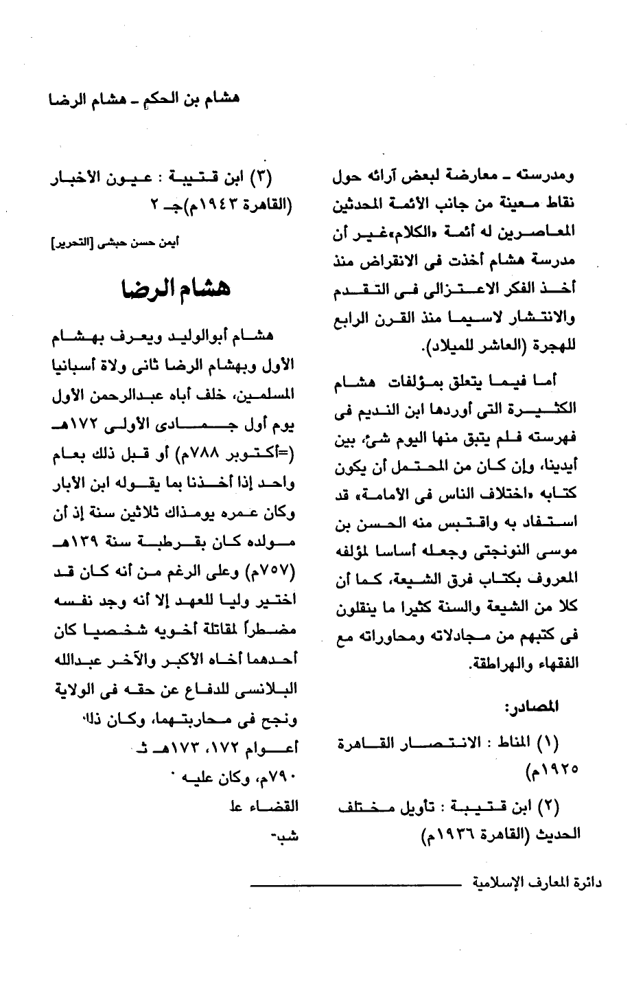 هشام أبو الوليد ويعرف بهشام الأول وبهشام الرضا ثانى ولاة أسبانيا المسلمين، خلف أباه عبد الرحمن الأول يوم أول جمادى الأولى 172 هـ (= أكتوبر 788 م) أو قبل ذلك بعام واحد إذا أخذنا بما يقوله ابن الأبار وكان عمره يومذاك ثلاثين سنة إذ أن مولده كان بقرطبة سنة 139 هـ (757 م) وعلى الرغم من أنه كان قد اختير وليا للعهد إلا أنه وجد نفسه مضطرًا لمقاتلة أخويه شخصيا كان أحدهما أخاه الأكبر والآخر عبد اللَّه البلانسى للدفاع عن حقه فى الولاية ونجح فى محاربتهما، وكان ذلك فى أعوام 172,173 هـ[. . . . . .] (*) 790 م, وكان عليه [. . . . . .] (*) القضاء على [. . . . . .] (*)