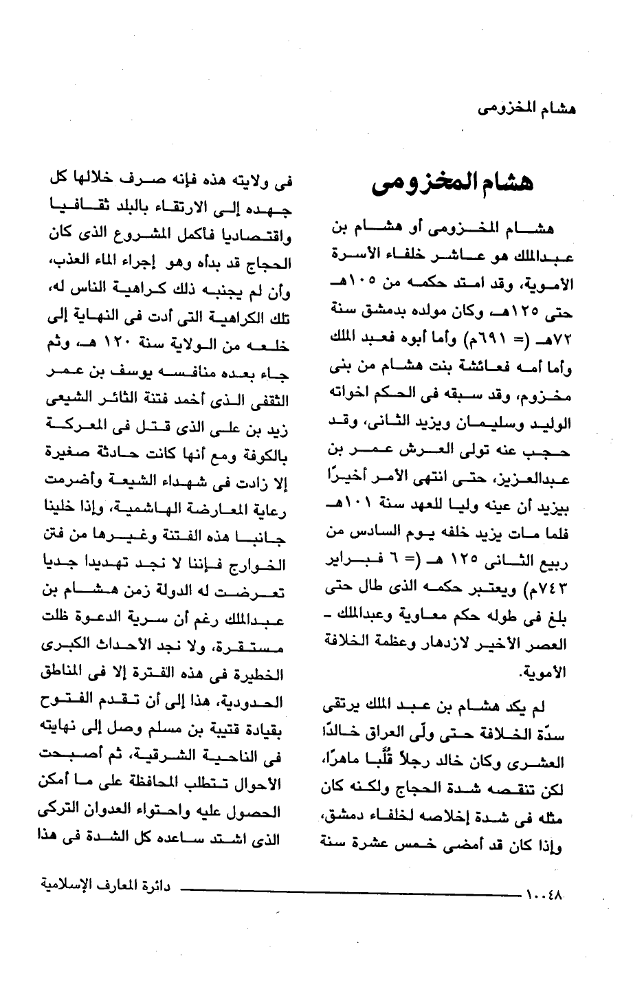 هشام المخزومى أو هشام بن عبد الملك هو عاشر خلفاء الأسرة الأموية، وقد امتد حكمه من 105 هـ حتى 125 هـ وكان مولده بدمشق سنة 72 هـ (= 691 م) وأما أبوه فعبد الملك وأما أمه فعائشة بنت هشام من بنى مخزوم، وقد سبقه فى الحكم اخواته الوليد وسليمان ويزيد الثانى، وقد حجب عنه تولى العرش عمر بن عبد العزيز، حتى انتهى الأمر أخيرًا بيزيد أن عينه وليا للعهد سنة 101 هـ فلما مات يزيد خلفه يوم السادس من ربيع الثانى 125 هـ (= 6 فبراير 743 م) ويعتبر حكمه الذى طال حتى بلغ فى طوله حكم معاوية وعبد الملك - العصر الأخير لازدهار وعظمة الخلافة الأموية.