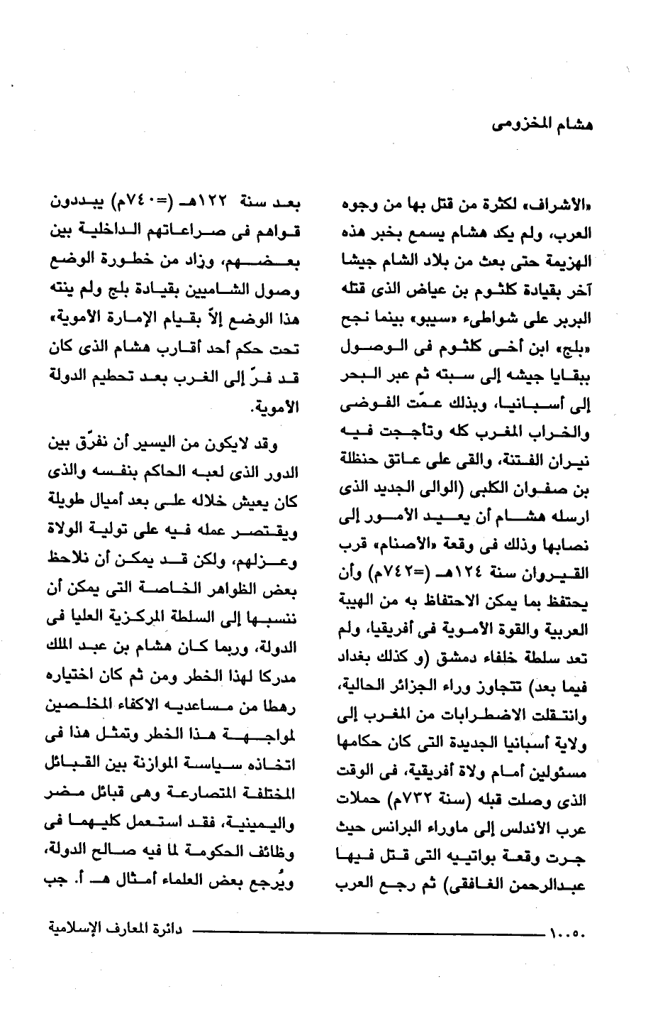"الأشراف" لكثرة من قتل بها من وجوه العرب، ولم يكد هشام يسمع بخبر هذه الهزيمة حتى بعث من بلاد الشام جيشا آخر بقيادة كلثوم بن عياض الذى قتله البربر على شواطئ "سيبو" بينما نجح "بلج" ابن أخى كلثوم فى الوصول ببقايا جيشه إلى سبته ثم عبر البحر إلى أسبانيا، وبذلك عمّت الفوضى والخراب المغرب كله وتأججت فيه نيران الفتنة، وألقى على عاتق حنظلة بن صفوان الكلبى (الوالى الجديد الذى أرسله هشام أن يعيد الأمور إلى نصابها وذلك فى وقعة "الأصنام" قرب القيروان سنة 124 هـ (= 742 م) وأن يحتفظ بما يمكن الاحتفاظ به من الهيبة العربية والقوة الأموية فى أفريقيا، ولم تعد سلطة خلفاء دمشق (وكذلك بغداد فيما بعد) تتجاوز وراء الجزائر الحالية، وانتقلت الإضطرابات من المغرب إلى ولاية أسبانيا الجديدة التى كان حكامها مسئولين أمام ولاة أفريقية، فى الوقت الذى وصلت قبله (سنة 732 م) حملات عرب الأندلس إلى ما وراء البرانس حيث جرت وقعة بواتييه التى قتل فيها عبد الرحمن الغافقى) ثم رجع العرب بعد سنة 122 هـ (= 740 م) يبددون قواهم فى صراعاتهم الداخلية بين بعضهم، وزاد من خطورة الوضع وصول الشاميين بقيادة بلج ولم ينته هذا الوضع إلّا بقيام الإمارة الأموية" تحت حكم أحد أقارب هشام الذى كان قد فرّ إلى الغرب بعد تحطيم الدولة الأموية.