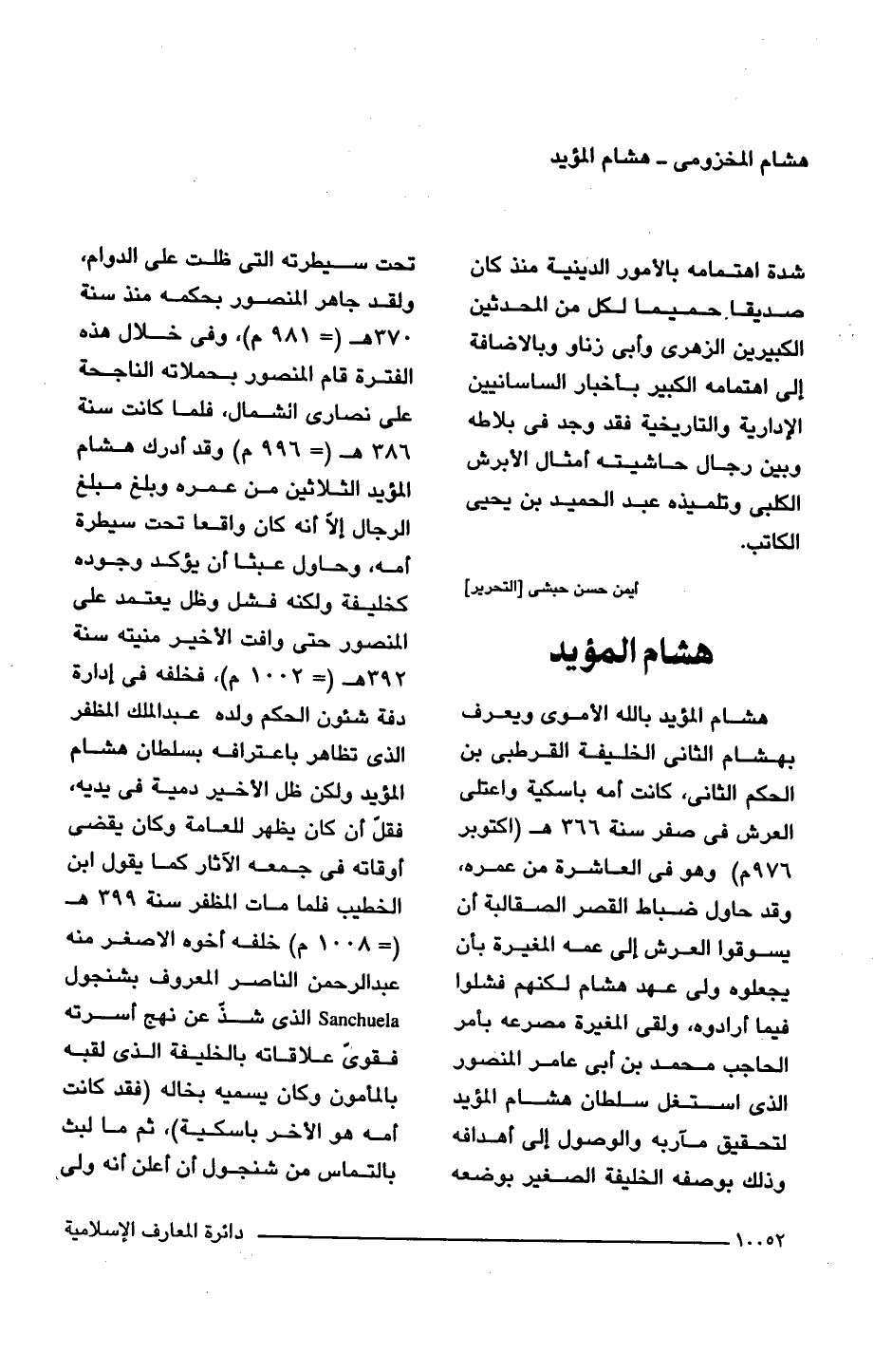 هشام المؤيد باللَّه الأموى ويعرف بهشام الثانى الخليفة القرطبى بن الحكم الثانى، كانت أمه باسكية واعتلى العرش فى صفر سنة 366 هـ (أكتوبر 976 م) وهو فى العاشرة من عمره، وقد حاول ضباط القصر الصقالبة أن يسوقوا العرش إلى عمه المغيرة بأن يجعلوه ولى عهد هشام لكنهم فشلوا فيما أرادوه، ولقى المغيرة مصرعه بأمر الحاجب محمد بن أبى عامر المنصور الذى استغل سلطان هشام المؤيد لتحقيق مآربه والوصول إلى أهدافه وذلك بوصفه الخليفة الصغير بوضعه تحت سيطرته التى ظلت على الدوام، ولقد جاهر المنصور بحكمه منذ سنة 370 هـ (= 981 م) وفى خلال هذه الفترة قام المنصور بحملاته الناجحة على نصارى الشمال، فلما كانت سنة 386 هـ (= 996 م) وقد أدرك هشام المؤيد الثلاثين من عمره وبلغ مبلغ الرجال إلّا أنه كان واقعا تحت سيطرة أمه, وحاول عبثا أن يؤكد وجوده كخليفة ولكنه فشل وظل يعتمد على المنصور حتى وافت الأخير منيته سنة 392 هـ (= 1002 م)، فخلفه فى إدارة دفة شئون الحكم ولده عبد الملك المظفر الذى تظاهر باعترافه بسلطان هشام المؤيد ولكن ظل الأخير دمية فى يديه، فقلّ أن كان يظهر للعامة وكان يقضى أوقاته فى جمعه الآثار كما يقول ابن الخطيب فلما مات المظفر سنة 399 هـ (= 1008 م) خلفه أخوه الأصغر منه عبد الرحمن الناصر المعروف بشنجول Sanchuela الذى شذّ عن نهج أسرته فقوى علاقاته بالخليفة الذى لقبه بالمأمون وكان يسميه بخاله (فقد كانت أمه هو الأخر باسكية)، ثم ما لبث بالتماس من شنجول أن أعلن أنه ولى
