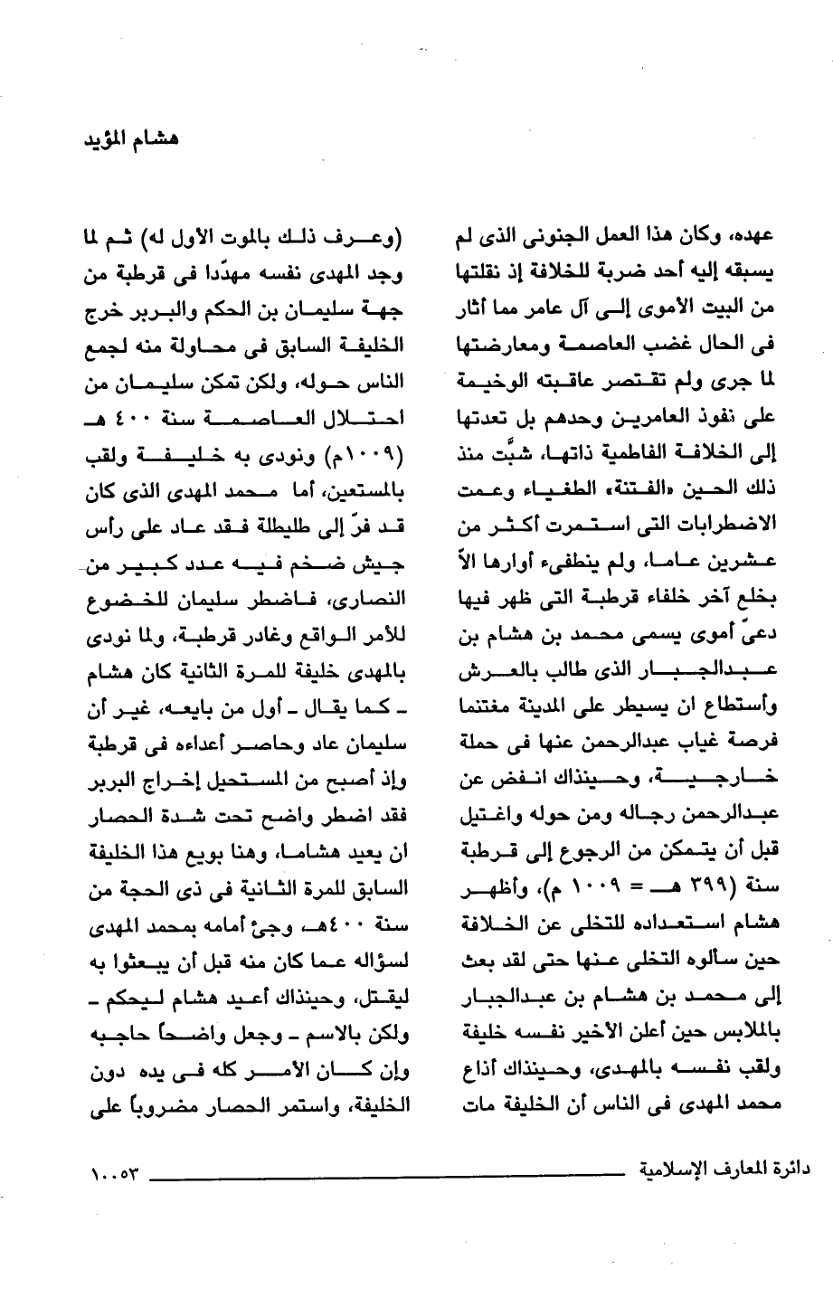 عهده، وكان هذا العمل الجنونى الذى لم يسبقه اليه أحد ضربة للخلافة إذ نقلتها من البيت الأموى إلى آل عامر مما أثار فى الحال غضب العاصمة ومعارضتها لما جرى ولم تقتصر عاقبته الوخيمة على نفوذ العامرين وحدهم بل تعدتها إلى الخلافة الفاطمية ذاتها، شبَّت منذ ذلك الحين "الفتنة" الطغياء وعمت الاضطرابات التى استمرت أكثر من عشرين عاما، ولم ينطفئ أوارها إلّا بخلع آخر خلفاء قرطبة التى ظهر فيها دعىّ أموى يسمى محمد بن هشام بن عبد الجبار الذى طالب بالعرش وأستطاع أن يسيطر على المدينة مغتنما فرصة غياب عبد الرحمن عنها فى حملة خارجية، وحينذاك انفض عن عبد الرحمن رجاله ومن حوله واغتيل قبل أن يتمكن من الرجوع إلى قرطبة سنة (399 هـ = 1009 م)، وأظهر هشام استعداده للتخلى عن الخلافة حين سألوه التخلى عنها حتى لقد بعث إلى محمد بن هشام بن عبد الجبار بالملابس حين أعلن الأخير نفسه خليفة ولقب نفسه بالمهدى، وحينذاك أذاع محمد المهدى فى الناس أن الخليفة مات (وعرف ذلك بالموت الأول له) ثم لما وجد المهدى نفسه مهدّدا فى قرطبة من جهة سليمان بن الحكم والبربر خرج الخليفة السابق فى محاولة منه لجمع الناس حوله، ولكن تمكن سليمان من احتلال العاصمة سنة 400 هـ (1009 م) ونودى به خليفة ولقب بالمستعين، أما محمد المهدى الذى كان قد فرّ إلى طليطلة فقد عاد على رأس جيش ضخم فيه عدد كبير من النصارى، فاضطر سليمان للخضوع للأمر الواقع وغادر قرطبة، ولما نودى بالمهدى خليفة للمرة الثانية كان هشام -كما يقال- أول من بايعه، غير أن سليمان عاد وحاصر أعداءه فى قرطبة وإذ أصبح من المستحيل إخراج البربر فقد اضطر واضح تحت شدة الحصار أن يعيد هشاما، وهنا بويع هذا الخليفة السابق للمرة الثانية فى ذى الحجة من سنة 400 هـ وجئ أمامه بمحمد المهدى لسؤاله عما كان منه قبل أن يبعثوا به ليقتل، وحينذاك أعيد هشام ليحكم -ولكن بالاسم- وجعل واضحًا حاجبه وإن كان الأمر كله فى يده دون الخليفة، واستمر الحصار مضروبًا على