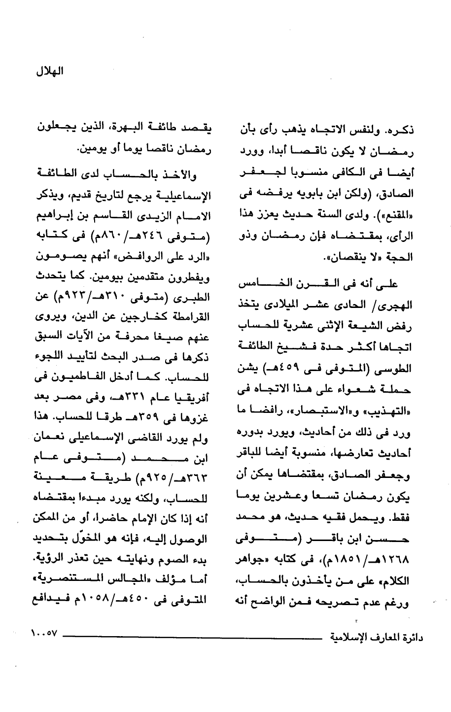 على أنه فى القرن الخامس الهجرى/ الحادى عشر الميلادى يتخذ رفض الشيعة الاثنى عشرية للحساب اتجاها أكثر حدة فشيخ الطائفة الطوسى (المتوفى فى 459 هـ) يشن حملة شعواء على هذا الاتجاه فى "التهذيب" و"الاستبصار"، رافضا ما ورد فى ذلك من أحاديث، ويورد بدوره أحاديث تعارضها، منسوبة أيضا للباقر وجعفر الصادق، بمقتضاها يمكن أن يكون رمضان تسعا وعشرين يوما فقط. ويحمل فقيه حديث، هو محمد حسن ابن باقر (متوفى 1268 هـ/ 1851 م)، فى كتابه "جواهر الكلام" على من يأخذون بالحساب، ورغم عدم تصريحه فمن الواضح أنه يقصد طائفة البهرة، الذين يجعلون رمضان ناقصا يوما أو يومين.