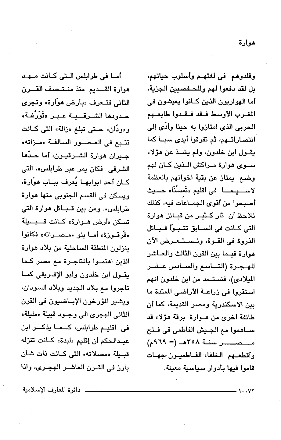 وقلدوهم فى لغتهم وأسلوب حياتهم، بل لقد دفعوا لهم وللحفصيين الجزية، أما الهواريون الذين كانوا يعيشون فى المغرب الأوسط فقد فقدوا طابعهم الحربى الذى امتازوا به حينا وأدّى إلى انتصاراتهم، ثم تفرقوا أيدى سبأ كما يقول ابن خلدون، ولم يشذ عن هؤلاء سوى هوارة مراكش الذين كان لهم وضع يمتاز عن بقية اخوانهم بالعظمة لاسيما فى اقليم "تَمِسْنَا" حيث أصبحوا من أقوى الجماعات فيه، كذلك نلاحظ أن ثار كثير من قبائل هوارة التى كانت فى السابق تتبوّأ قبائل الذروة فى القوة، ونستعرض الآن هوارة فيما بين القرن الثالث والعاشر للهجرة (التاسع والسادس عشر الميلادى)، فنستمد من ابن خلدون أنهم استقروا فى زراعة الأراضى الممتدة ما بين الاسكندرية ومصر القديمة، كما أن طائفة أخرى من هوارة برقة هؤلاء قد ساهموا مع الجيش الفاطمى فى فتح مصر سنة 358 هـ (= 969 م) وأقطعهم الخلفاء الفاطميون جهات قاموا فيها بأدوار سياسية معينة.