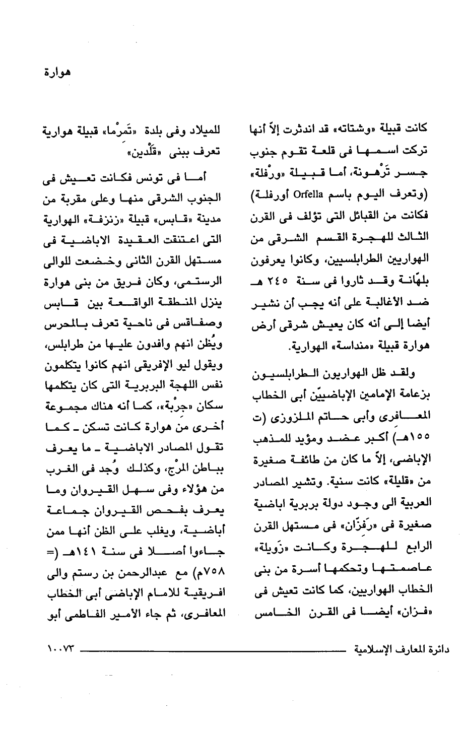 ولقد ظل الهواريون الطرابلسيون بزعامة الإمامين الإباضييّن أبى الخطاب المعافِرى وأبى حاتم الملزوزى (ت 155 هـ) أكبر عضد ومؤيد للمذهب الإباضى، إلّا ما كان من طائفة صغيرة من "قليلة" كانت سنية. وتشير المصادر العربية إلى وجود دولة بربرية اباضية صغيرة فى "رَفِزّان" فى مستهل القرن الرابع للهجرة وكانت "زَويلة" عاصمتها وتحكمها أسرة من بنى الخطاب الهواريين، كما كانت تعيش فى "فزان" أيضا فى القرن الخامس للميلاد وفى بلدة "تَمِرْما" قبيلة هوارية تعرف ببنى "قَلْدين"