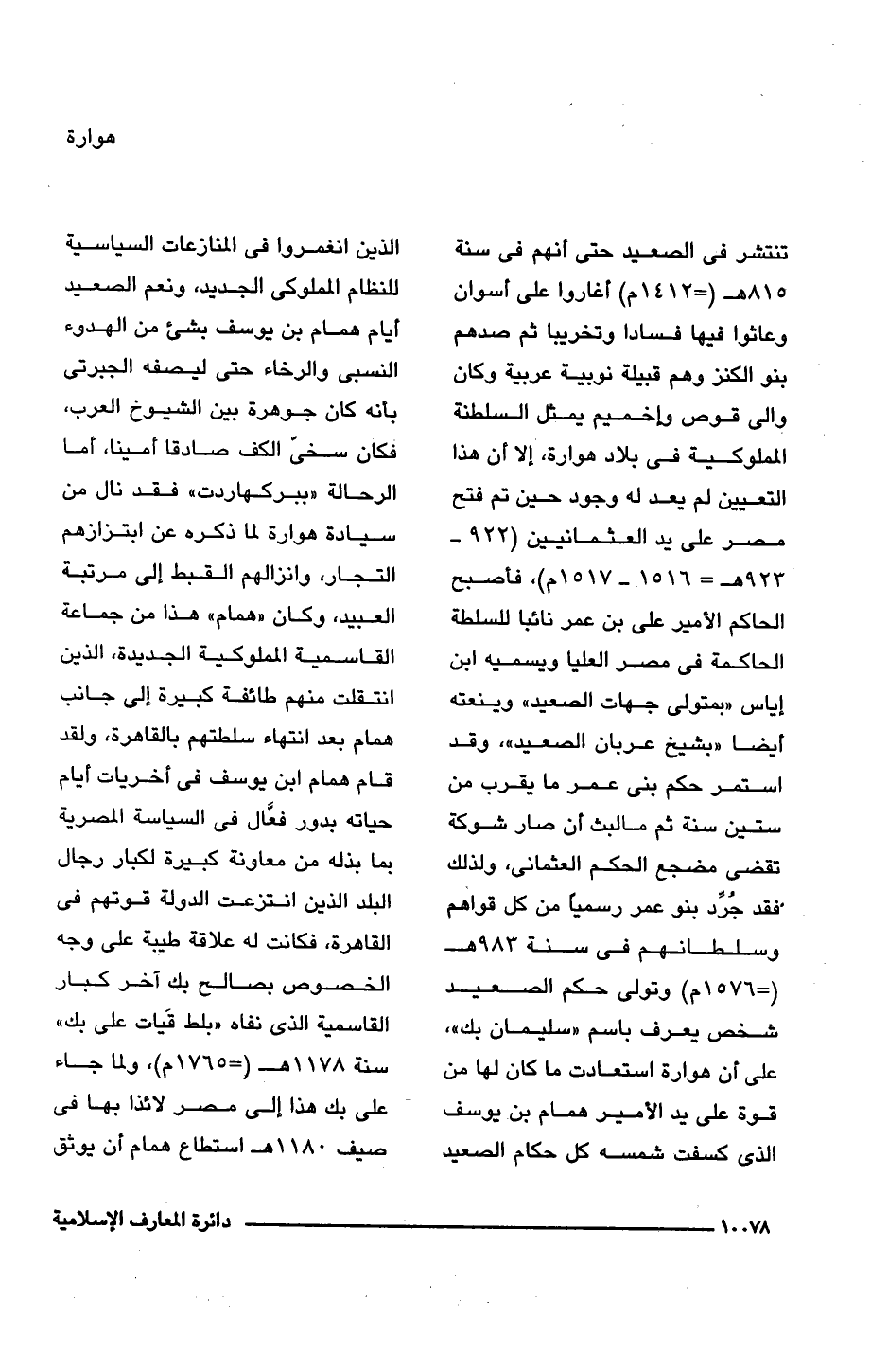 تنتشر فى الصعيد حتى أنهم فى سنة 815 هـ (= 1412 م) أغاروا على أسوان وعاثوا فيها فسادا وتخريبا ثم صدهم بنو الكنز وهم قبيلة نوبية عربية وكان والى قوص وإخميم يمثل السلطنة المملوكية فى بلاد هوارة، إلا أن هذا التعيين لم يعد له وجود حين تم فتح مصر على يد العثمانيين (922 - 923 هـ = 1516 - 1517 م)، فأصبح الحاكم الأمير على بن عمر نائبًا للسلطة الحاكمة فى مصر العليا ويسميه ابن إياس "بمتولى جهات الصعيد" وينعته أيضًا "بشيخ عربان الصعيد"، وقد استمر حكم بنى عمر ما يقرب من ستين سنة ثم مالبث أن صار شوكة تقضّ مضجع الحكم العثمانى، ولذلك فقد جُرِّد بنو عمر رسميًا من كل قواهم وسلطانهم فى سنة 983 هـ (= 1576 م) وتولى حكم الصعيد شخص يعرف باسم "سليمان بك"، على أن هوارة استعادت ما كان لها من قوة على يد الأمير همام بن يوسف الذى كسفت شمسه كل حكام الصعيد الذين انغمروا فى المنازعات السياسية للنظام المملوكى الجديد، ونعم الصعيد أيام همام بن يوسف بشئ من الهدوء النسبى والرخاء حتى ليصفه الجبرتى بأنه كان جوهرة بين الشيوخ العرب، فكان سخّى الكف صادقًا أمينًا، أما الرحالة "ببركهاردت" فقد نال من سيادة هوارة لما ذكره عن ابتزازهم التجار، وانزالهم القبط إلى مرتبة العبيد، وكان "همام" هذا من جماعة القاسمية المملوكية الجديدة، الذين انتقلت منهم طائفة كبيرة إلى جانب همام بعد انتهاء سلطتهم بالقاهرة، ولقد قام همام ابن يوسف فى أخريات أيام حياته بدور فعّال فى السياسة المصرية بما بذله من معاونة كبيرة لكبار رجال البلد الذين انتزعت الدولة قوتهم فى القاهرة، فكانت له علاقة طيبة على وجه الخصوص بصالح بك آخر كبار القاسمية الذى نفاه "بلط قَيات على بك" سنة 1178 هـ (= 1765 م)، ولما جاء على بك هذا إلى مصر لائذا بها فى صيف 1180 هـ استطاع همام أن يوثق