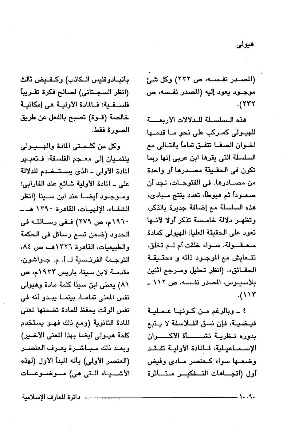 وكل من كلمتى المادة والهيولى ينتميان إلى معجم الفلسفة، فتعبير المادة الأولى -الذى يستخدم للدلالة على- المادة الأولية شائع عند الفارابى؛ وموجود أيضا عند ابن سينا (انظر الشفاء، الإلهيات، القاهرة 1390 هـ - 1960 م، ص 279) ففى رسالته فى الحدود (ضمن تسع رسائل فى الحكمة والطبيعيات، القاهرة 1326 هـ، ص 84، الترجمة الفرنسية لـ أ. م. جواشون، مقدمة لابن سينا، باريس 1933 م، ص 81) يعطى ابن سينا كلمة مادة وهيولى نفس المعنى تماما، بينما يبدو أنه فى نفس الوقت يحفظ للمادة تضمنها لمعنى المادة الثانوية (ومع ذلك فهو يستخدم كلمة هيولى أيضا بهذا المعنى الأخير) وبعد ذلك مباشرة يعرف العنصر (العنصر الأولى) بأنه المبدأ الأول (لهذه الأشياء التى هى) موضوعات