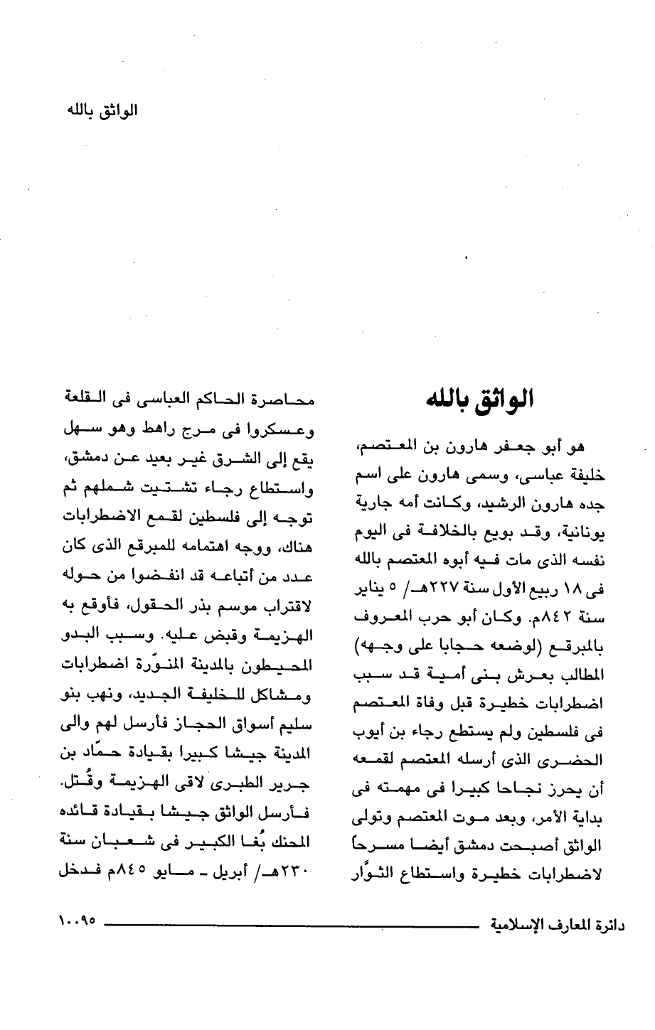 هو أبو جعفر هارون بن المعتصم، خليفة عباسى، وسمى هارون على اسم جده هارون الرشيد، وكانت أمه جارية يونانية، وقد بويع بالخلافة فى اليوم نفسه الذى مات فيه أبوه المعتصم باللَّه فى 18 ربيع الأول سنة 227 هـ/ 5 يناير سنة 842 م. وكان أبو حرب المعروف بالمبرقع (لوضعه حجابا على وجهه) المطالب بعرش بنى أمية قد سبب اضطرابات خطيرة قبل وفاة المعتصم فى فلسطين ولم يستطع رجاء بن أيوب الحضرى الذى أرسله المعتصم لقمعه أن يحرز نجاحا كبيرا فى مهمته فى بداية الأمر، وبعد موت المعتصم وتولى الواثق أصبحت دمشق أيضا مسرحًا لاضطرابات خطيرة واستطاع الثوَّار محاصرة الحاكم العباسى فى القلعة وعسكروا فى مرج راهط وهو سهل يقع إلى الشرق غير بعيد عن دمشق، واستطاع رجاء تشتيت شملهم ثم توجه إلى فلسطين لقمع الاضطرابات هناك، ووجه اهتمامه للمبرقع الذى كان عدد من أتباعه قد انفضوا من حوله لاقتراب موسم بذر الحقول، فأوقع به الهزيمة وقبض عبيه. وسبب البدو المحيطون بالمدينة المنوّرة اضطرابات ومشاكل للخليفة الجديد، ونهب بنو سليم أسواق الحجاز فأرسل لهم والى المدينة جيشا كبيرا بقيادة حمّاد بن جرير الطبرى لاقى الهزيمة وقُتل. فأرسل الواثق جيشا بقيادة قائده المحنك بُغا الكبير فى شعبان سنة 230 هـ/ أبريل - مايو 845 م فدخل