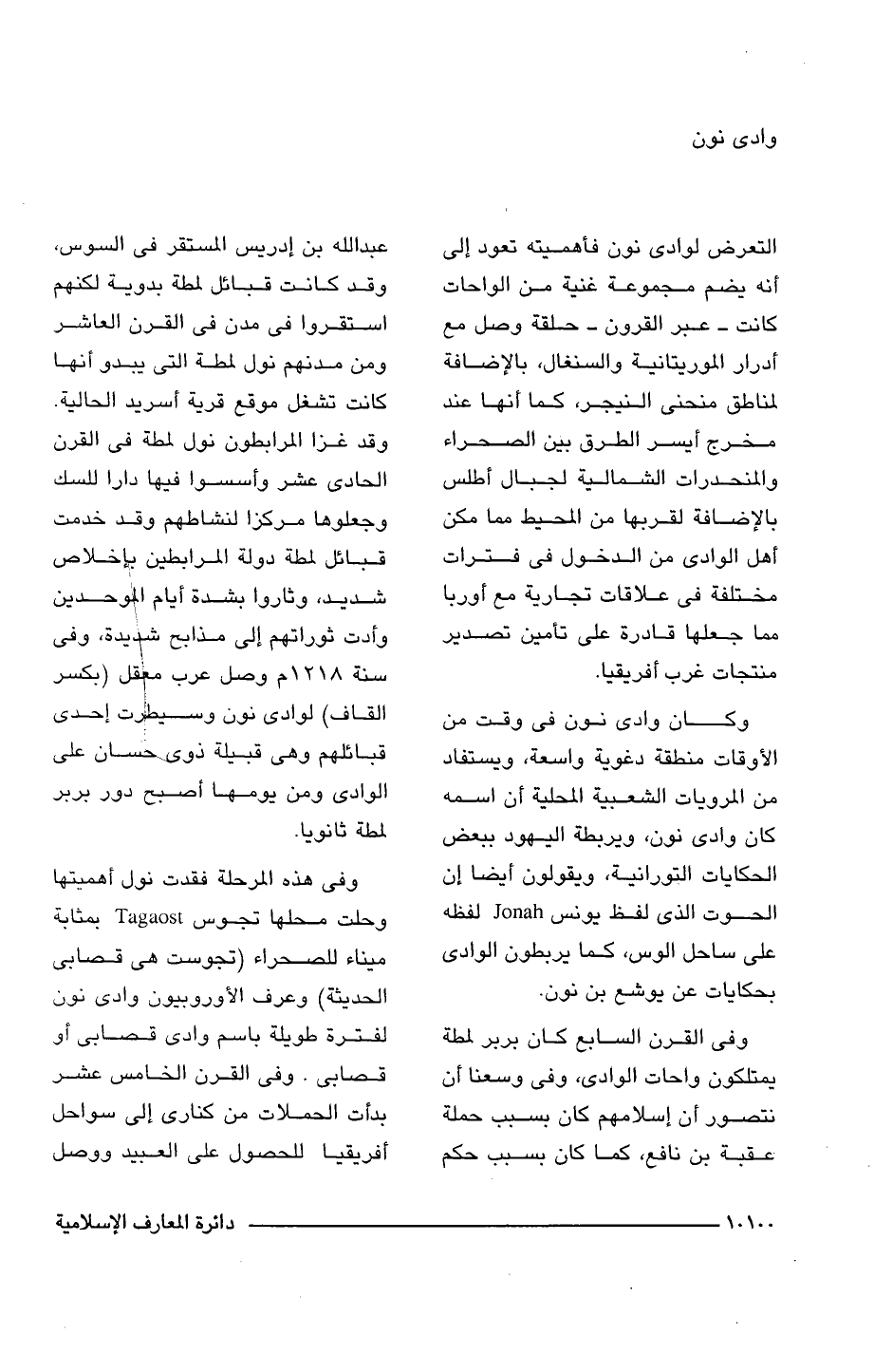 التعرض لوادى نون فأهميته تعود إلى أنه يضم مجموعة غنية من الواحات كانت -عبر القرون- حلقة وصل مع أدرار الموريتانية والسنغال، بالإضافة لمناطق منحنى النيجر، كما أنها عند مخرج أيسر الطرق بين الصحراء والمنحدرات الشمالية لجبال أطلس بالإضافة لقربها من المحيط مما مكن أهل الوادى من الدخول فى فترات مختلفة فى علاقات تجارية مع أوربا مما جعلها قادرة على تأمين تصدير منتجات غرب أفريقيا.