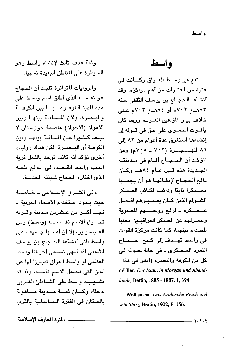 تقع فى وسط العراق وكانت فى فترة من الفترات من أهم مراكزه. وقد أنشأها الحجاج بن يوسف الثقفى سنة 83 هـ/ 702 م أو 84 هـ/ 703 م على خلاف بين المؤلفين العرب، وربما كان ياقوت الحموى على حق فى قوله إن إنشاءها استغرق عدة أعوام من 83 إلى 86 للهجرة (702 - 705 م) ومن المؤكد أن الحجاج أقام فى مدينته الجديدة هذه قبل عام 84 هـ. وكان دافع الحجاج لإنشائها هو أن يجعلها معسكرا ثابتا ودائما لكتائب العسكر الشوام الذين كان يعتبرهم أفضل عسكره -لرفع روحهم المعنوية وليعزلهم عن العسكر العراقيين تجنبا للصدام بينهما، كما كانت مركزة القوات فى واسط تهدف إلى كبح جماح التمرد العسكرى- فى حالة حدوثه فى كل من الكوفة والبصرة (انظر فى هذا: mUller: Der Islam in Morgan und Abend lande. Berlin, 1885 - 1887, 1, 394