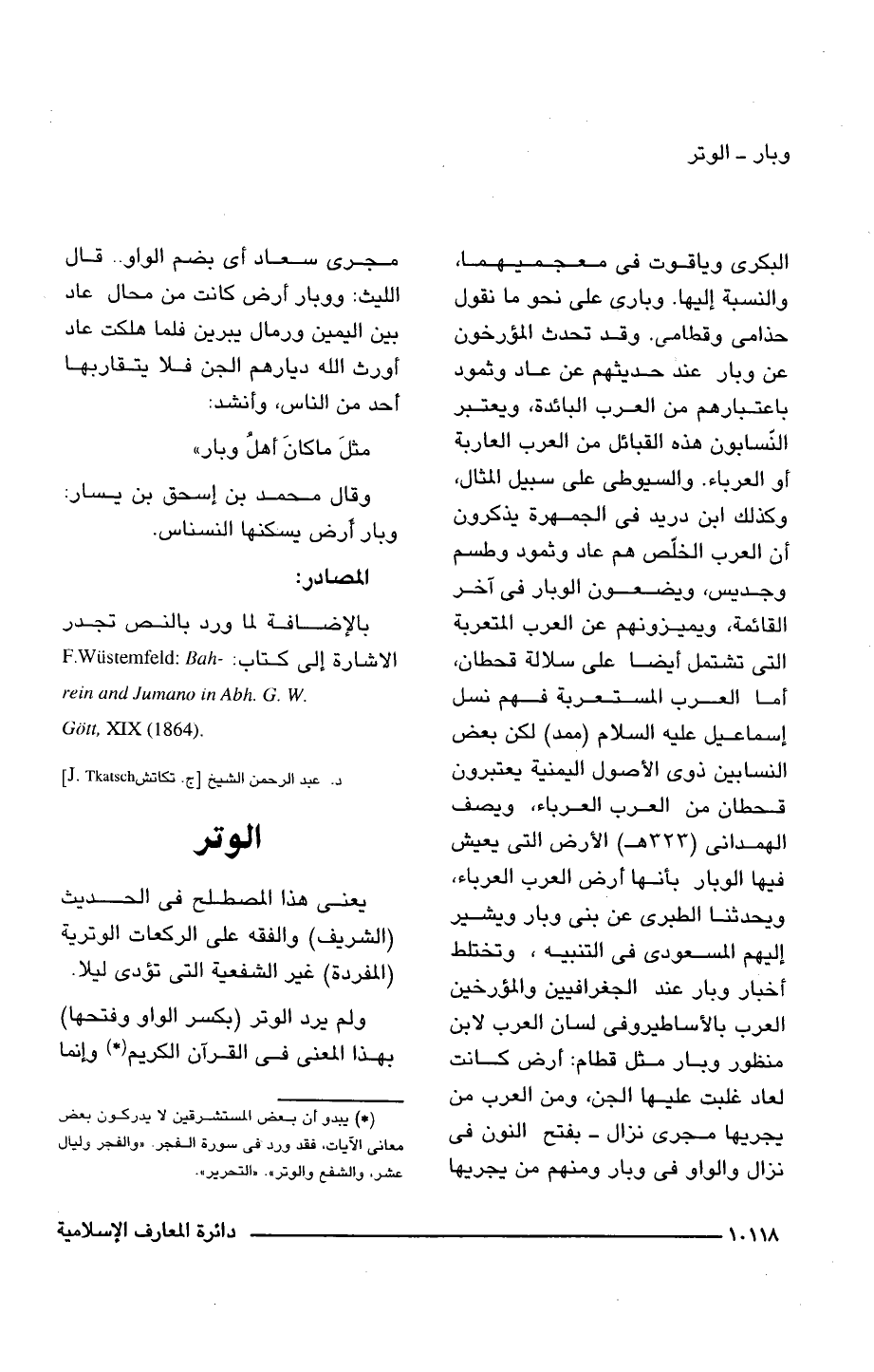 البكرى وياقوت فى معجميهما، والنسبة إليها. وبارى على نحو ما نقول حذامى وقطامى. وقد تحدث المؤرخون عن وبار عند حديثهم عن عاد وثمود باعتبارهم من العرب البائدة، ويعتبر النّسابون هذه القبائل من العرب العاربة أو العرباء. والسيوطى على سبيل المثال، وكذلك ابن دريد فى الجمهرة يذكرون أن العرب الخلّص هم عاد وثمود وطسم وجديس، ويضعون الوبار فى آخر القائمة، ويميزونهم عن العرب المتعربة التى تشتمل أيضا على سلالة قحطان، أما العرب المستعربة فهم نسل إسماعيل عليه السلام (ممد) لكن بعض النسابين ذوى الأصول اليمنية يعتبرون قحطان من العرب العرباء، ويصف الهمدانى (323 هـ) الأرض التى يعيش فيها الوبار بأنها أرض العرب العرباء، ويحدثنا الطبرى عن بنى وبار ويشير إليهم المسعودى فى التنبيه، وتختلط أخبار وبار عند الجغرافيين والمؤرخين العرب بالأساطير وفى لسان العرب لابن منظور وبار مثل قطام: أرض كانت لعاد غلبت عليها الجن، ومن العرب من يجريها مجرى نزال -بفتح النون فى نزال والواو فى وبار ومنهم من يجريها مجرى سعاد أى بضم الواو. . قال الليث: ووبار أرض كانت من محال عاد بين اليمين ورمال يبرين فلما هلكت عاد أورث اللَّه ديارهم الجن فلا يتقاربها أحد من الناس، وأنشد: